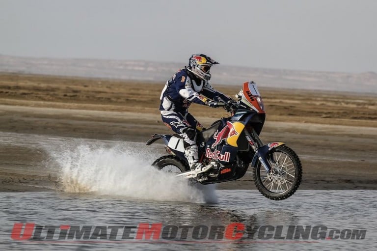 KTM reports that riders are stationed in the desert bivouac outside of Doha and each day are on their bikes for four to five hours riding a loop circuit mostly in excess of 250 miles, of which more than 98 percent is timed special. The rally concludes on Friday with a shorter 175-mile stage of which 170 miles is timed special.