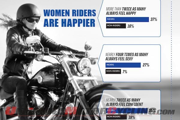 According to the study, more than half (53 percent) of women who ride cite their motorcycle as a key source of happiness and nearly three in four (74 percent) believe their lives have improved since they started riding.
