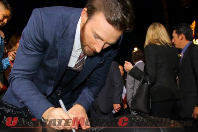 The bike was autographed by the stars of the film. And to commemorate the film premier, The Motor Company donated the autographed bike to Evans, who will award the machine to a charity of his choice.