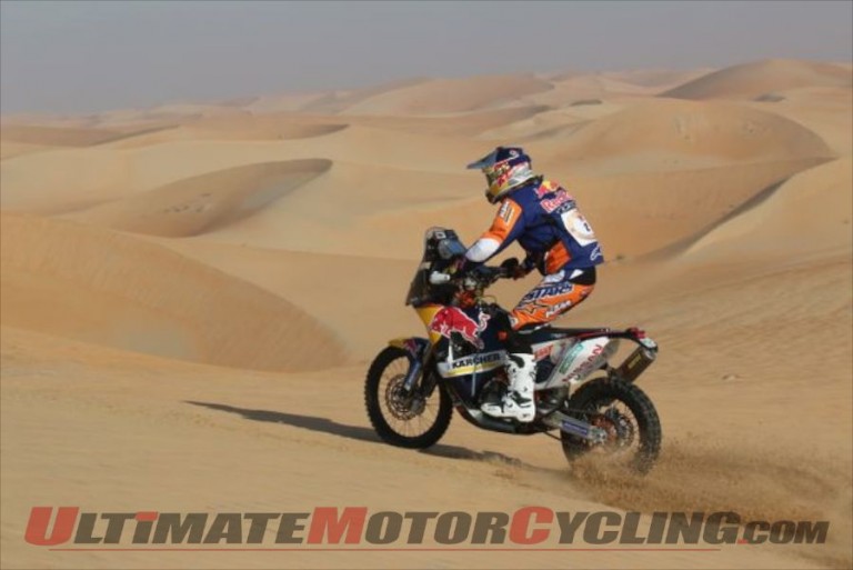 The stage took riders a total of 488 kilometers from Madinat Zayed to Moreeb, and when it completed, Red Bull KTM’s Marc Coma took the top time. He finished two minutes ahead of his teammate and stage-one winner, Sam Sunderland.