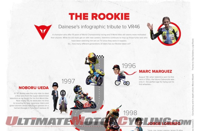 The infographic shows all the rookies Rossi has competed with, and mostly defeated, including Nicky Hayden, Loris Capirossi, Kenny Roberts Jr., and of course two-time MotoGP Champion Marc Marquez.