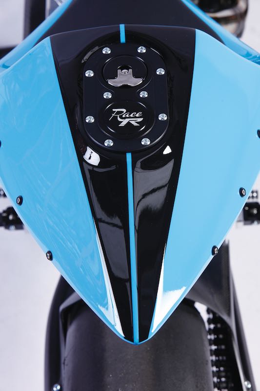 The classic American Muscle style involves racing stripes, a trait that Carol Shelby popularized and made a fixture of Americana. It is a design trait that many have imitated, but few have replicated properly. From nose to tail, the dark dual stripes run through the light-blue paint that only a bike with these kinds of numbers could get away with. Sleek contour pro ling adorns the Collector Race R, and it is apparent that this is something more than a simple compendium of the inspirations of others.