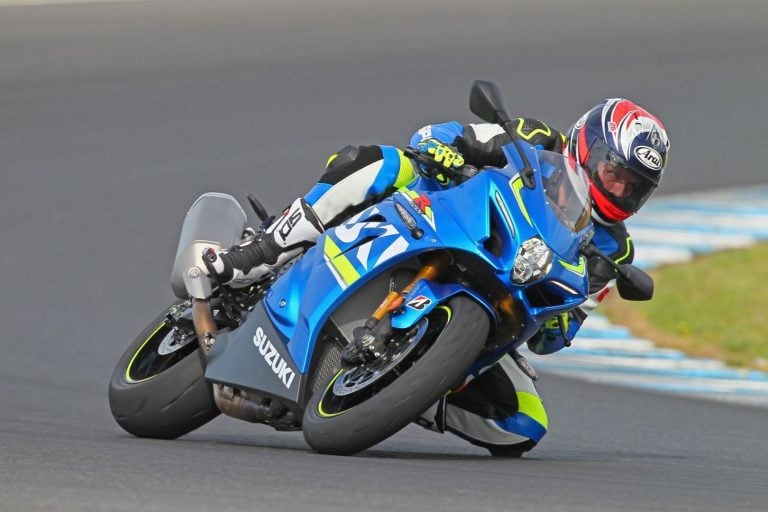 5. The GSX-R is stable and yet agile. This is a bike that wants to treat you nicely. It simply doesn’t want to chuck you off and there is zero nervousness anywhere, at any time. Turn-in is faster than the old model, and that caught me out a couple of times until I got used to it. I felt so connected to the bike, that changing line—or adding or subtracting lean angle in the middle of a turn—could be done at will, without any wobbling or handlebar shaking. The GSX-R1000R is so well disciplined it simply does what you ask of it. When hard on the brakes, the chassis stays perfectly stable, with no waggling at the rear at all. Even the rear sliding when coming onto the front straight at Phillip Island in fourth gear with the speedometer well into triple digits didn’t upset the chassis.