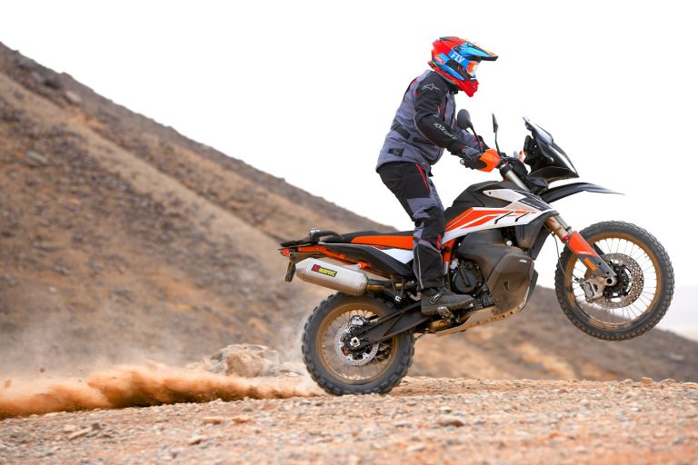 6. The WP Xplor suspension on the 790 Adventure R works deceptively well. The R feels like it’s floating across desert chop at incredibly high speeds, so a keen eye is necessary to look out for fast-approaching obstacles. The 48mm fork stays up in the stroke and soaks up large G-outs. This provides for soft and controlled landings when launching at speed, all the while the rear stays straight and balanced. The experience is confidence-inspiring and more akin to riding a 450cc enduro bike than a twin cylinder adventure bike. For increased stability, a WP steering damper is a welcome standard feature.