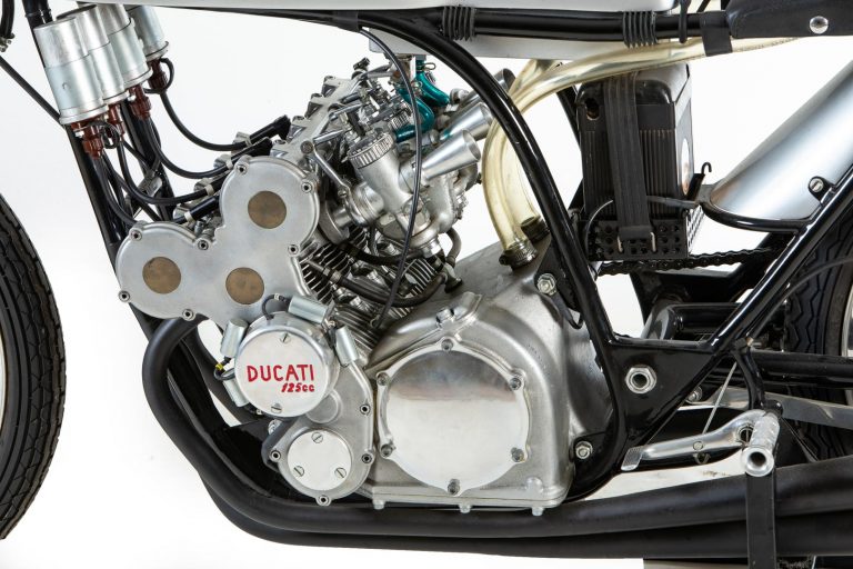 We are all familiar with the Ducati Desmosedici V4 powerplant. However, many people do not know that Ducati built an inline-4 motor for the 125 GP class (the precursor to today’s Moto3 class), and that is was the Italian manufacturer’s first four-cylinder engine. Now that you know about it, you can bid on this 1965 Ducati 125cc GP racer at Bonhams’ The Summer Sale at Bicester Heritage, running from August 14 through 16.