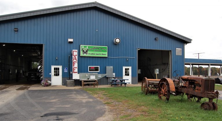 But the most important thing to know about Laughing Larry’s Lunchroom is that it is very easy to miss—all but invisible, housed in a mammoth twin-bay truck wash! It is slipped in between the truck wash bays of the Award Winning Truck Wash Service. From the outside, the front of the place features an antique, iron-wheel Allis-Chalmers tractor, picnic table, wooden bench, and a huge, blue steel-skinned building with the truck wash bay doors at each side.