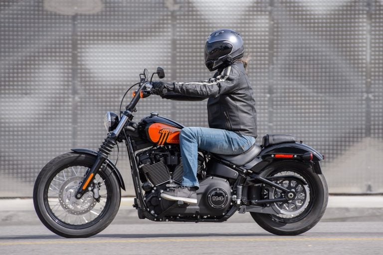 - Braking is always an essential part of going fast, and the Street Bob 114 will slow you down quickly—if you have the grip strength. Some Harley-Davidsons rely on the rear brake for deceleration. That’s not the case with the Street Bob 114, as the rear brake feels weak and is awkward to use. Instead, you’ll become well-acquainted with the 300mm disc on the proudly wire-spoke front wheel. Most of the time, it’s easy to slow the Street Bob down adequately. However, in situations where hard braking is needed, make sure you have a strong grip—plenty of pressure needs to be applied to the lever. As always, downshifting helps, and the six-speed Cruise Drive transmission is a willing accomplice, though you will want to keep in mind that the clutch does not have a slipper function.
