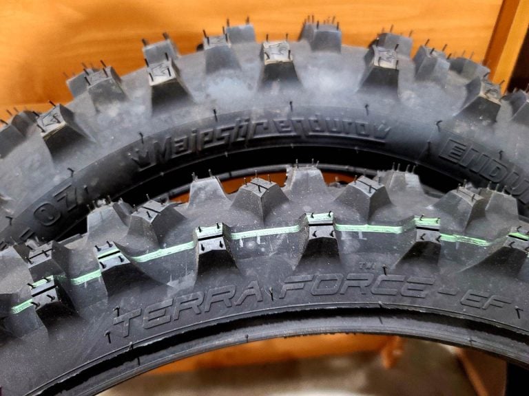 Both tires are part of the Mitas Enduro Competition lineup. As Mitas is based in the Czech Republic, enduro competition means the FIM Enduro World Championship series. As a result, the DOT-legal Mitas Terra Force-EF and EF-07 Majestic Enduro tires also meet the FIM environmentalist-driven standards for EnduroGP tires. The most notable regulation is that the knobs can be just 13mm tall—just a little over a half-inch. Fortunately, the shorter knobs work better for enduro and dual sport riding than the tall-knobbed motocross tires we prefer on groomed tracks.