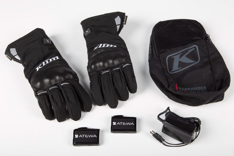 The Klim Hardanger HTD gloves are feature-rich, and all of them directly benefit the rider. They are warm, waterproof, windproof, breathable (Gore-Tex), comfortable, have a visor wiper, mobile-phone-compatible thumb and index-finger tips, and have three levels of battery-generated heat for up to a claimed eight hours.