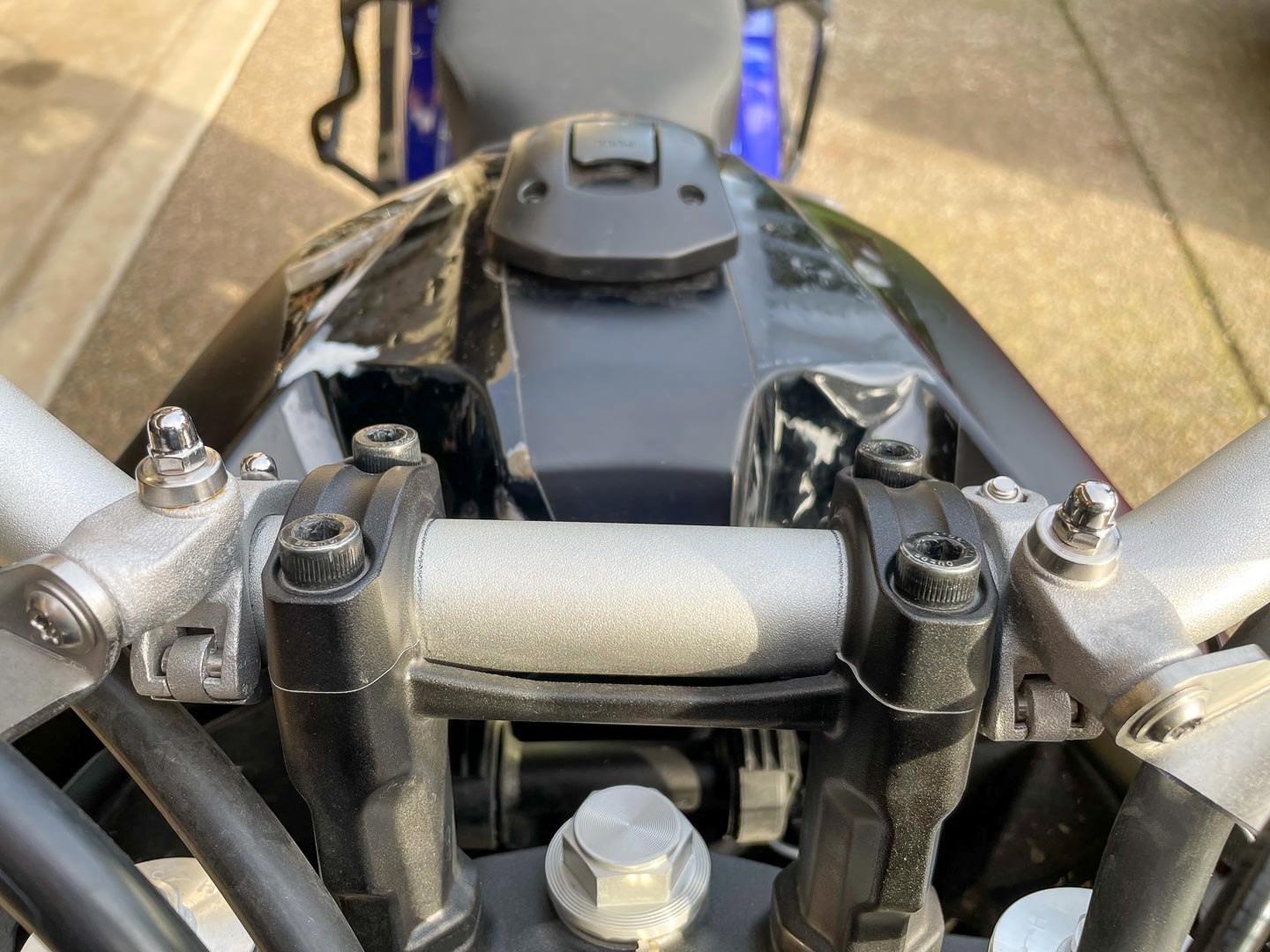 Installation is as simple—take out four stock screws, position the riser, install four supplied screws, put the handlebar into its new holder, align the pencil marks and bubble level, and torque down the four stock screws. The total install time was 15 minutes.