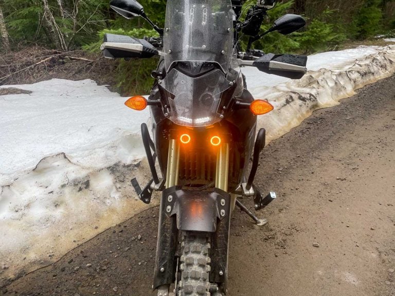 The kit from Cyclops Adventure Sports in Kent, Wash., works off the Hi/Lo Beam switch and turns with the handlebars. The Cyclops wiring harness magic is just a $60 add-on to the $296 list price for the pair of 19-watt Aurora two-inch LEDs. I also went with the optional Amber Halo Ring daytime running light version, which added another $50. They look awesome, and act like daytime running lights when the headlight switch is set on low beam. The Cyclops wiring harness eliminated my worry about tapping into the wrong wire on the Ténéré 700 and blowing up the $400 ECU.