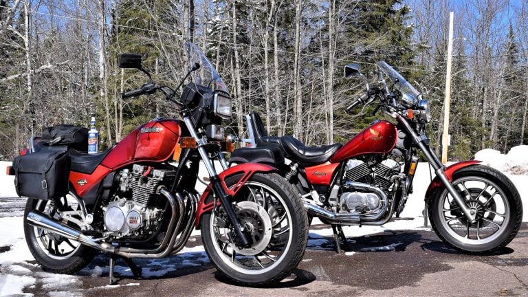 I tend to start my riding season when air temps are in the 40s and snow still on the ground—conditions that can make 40-year-old bikes reluctant to fire up. The Seca and Shadow are two particularly good examples to focus on. They are kept in the far north, get ridden least often, and sit through the longest period of winter conditions fully fueled up. Neither of these bikes has ever had the carburetors replaced, rebuilt, or even given an off-the-bike cleaning. Yet, this spring, as in years past, despite cold (temps hovering in the 40s) conditions and snow still on the ground, both old street bike motors fired right up and ran like new. How is that possible?