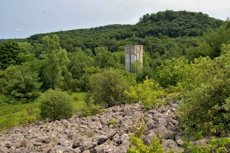 I was on a solo road trip back in 2011, cruising north on Wisconsin State Trunk Highway 131. Shortly after leaving La Farge, I noticed something sticking up in the woods to my left. It was one of those things that simply looked like it shouldn’t be there. It was a large, gray square-looking thing—a tower or obelisk of some kind.