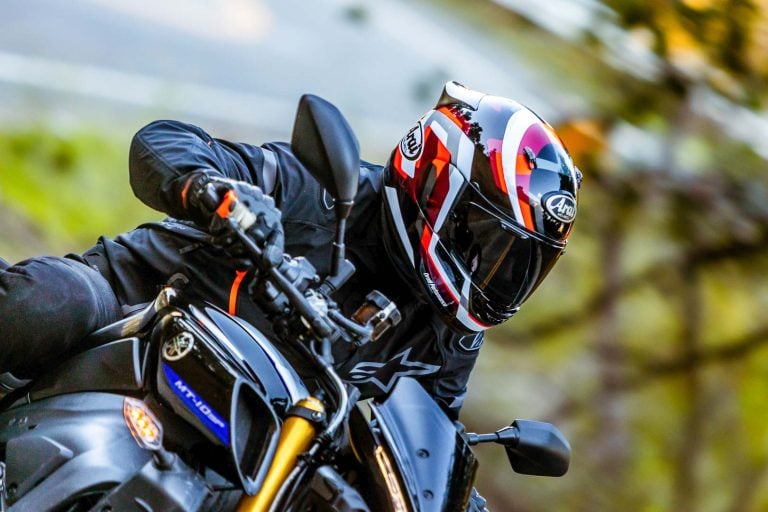 That brings us to the Contour’s racier appearance, as it is endowed with a sizable spoiler inspired by the optional DF-X2 available for the Corsair-X. In addition, the lower rear exhausts are pronounced in the name of slicing through the air. A few spirited runs on the Yamaha MT-10 SP proved that spoiler keeps things nice and stable, with no lift or headshake—what you’d expect from it being positioned as Arai’s sensibly sporty helmet.