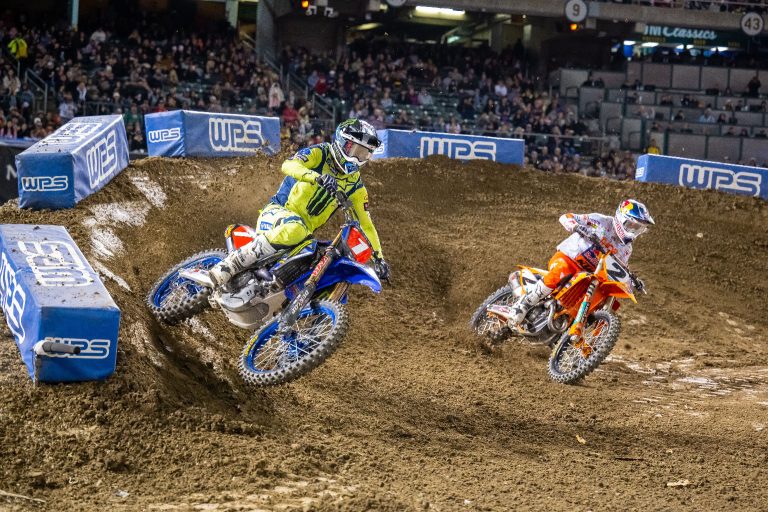 Despite the challenging Oakland track with its 19-jump rhythm section, as well as two whoops sections, there were very few crashes. Only Sexton’s mishap affected the top five finishing positions. It appeared Sexton would easily take the win as he was leading comfortably by five seconds over Tomac when he tripled into a corner and went down.