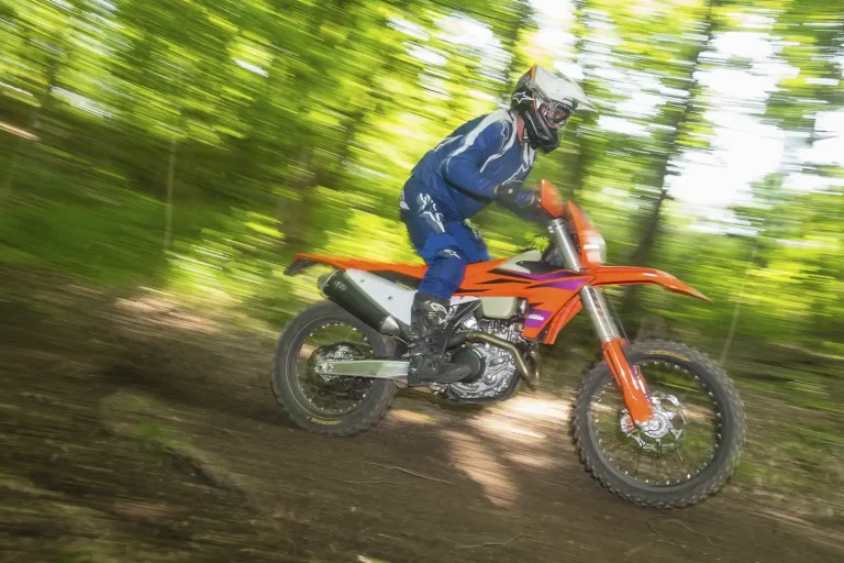 - The big thumper’s power delivery is as smooth or sharp as you like. By using different combinations of engine maps and traction control, there are effectively four noticeably different modes available for the short-stroke 450cc SOHC motor. There is a catch, however. To access the features, you need a KTM PowerParts switch that should run you less than $200—we haven’t gotten a final price from KTM. That’s kind of a nickel-and-dime thing, as it adds less than two percent to the $11,999 MSRP for the 2024 KTM 450 XCF-W. The switch also unlocks the switchable quickshifter function, so consider it a must-have option.