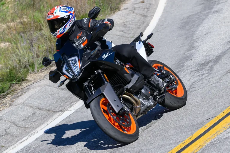 - Braking is in line with what you’d expect for a sport-touring motorcycle. The three calipers are KTM branded, though we suspect they’re J.Juan-sourced. The front calipers get radially mounted, and with the 320mm discs, there’s plenty of stopping power with good feel—don’t forget to credit the high-traction Michelin Power GP rubber. The electronics package includes the excellent cornering-aware Bosch MP 9.3 software, with a Supermoto mode if you want to back it into turns.