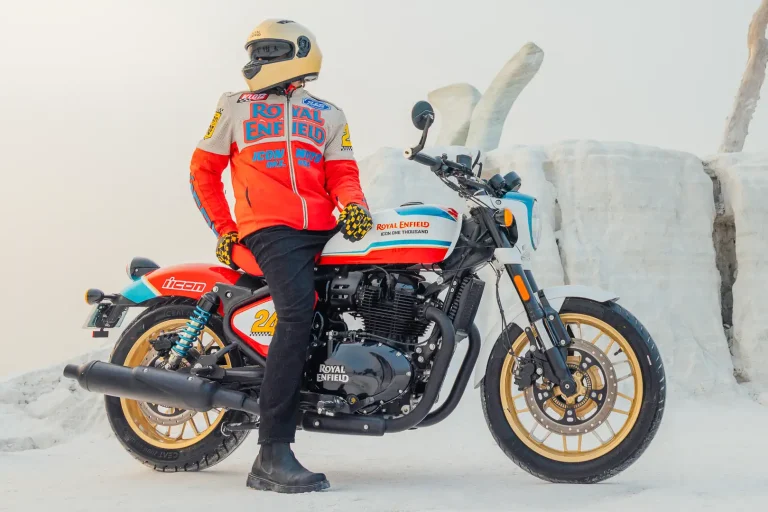 - A three-color paint job inspired by Royal Enfield’s racing efforts and Icon graphics.
