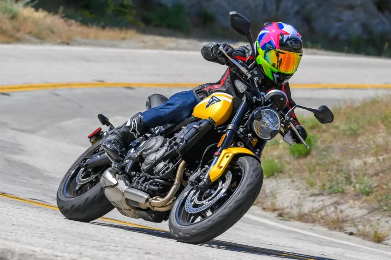 - The Showa suspension remains non-adjustable but gets an upgrade for 2025. The inverted 41mm Showa fork returns but has been upgraded from the SFF to the SFF-BP (Big Piston). Along with the new aluminum top triple clamp, the Trident’s front-end stability is inspiringly firm when pushing an aggressive pace in corners. That’s always a blast when you have a smooth stretch of asphalt, but I was relaxing my throttle hand when conditions got less than pristine. There’s plenty of front-end feedback, and while the Trident remains composed on a rough road, it’s just not comfortable. There are no changes to the shock, which can be adjusted for spring preload.
