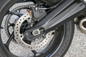 - Brakes are well-matched with the Tiger Sport 660’s capabilities. Whether I was speed testing the bike on an open desert highway, or getting hard on the brakes in canyon twisties, the Nissin two-piston calipers and the 310mm discs provide complete confidence. The adjustable lever has a soft initial engagement, followed by a strong linear response. While I didn’t find the need to supplement with the 255mm rear disc to haul the Tiger down quickly, I was still happy to discover that the slippery, stubby, black-painted pedal from 2022 is gone. In its place is a proper-length serrated unit with good grip and feel.