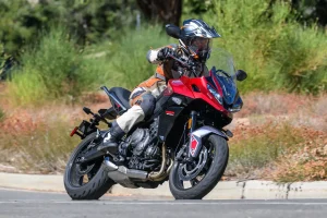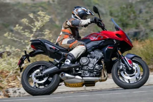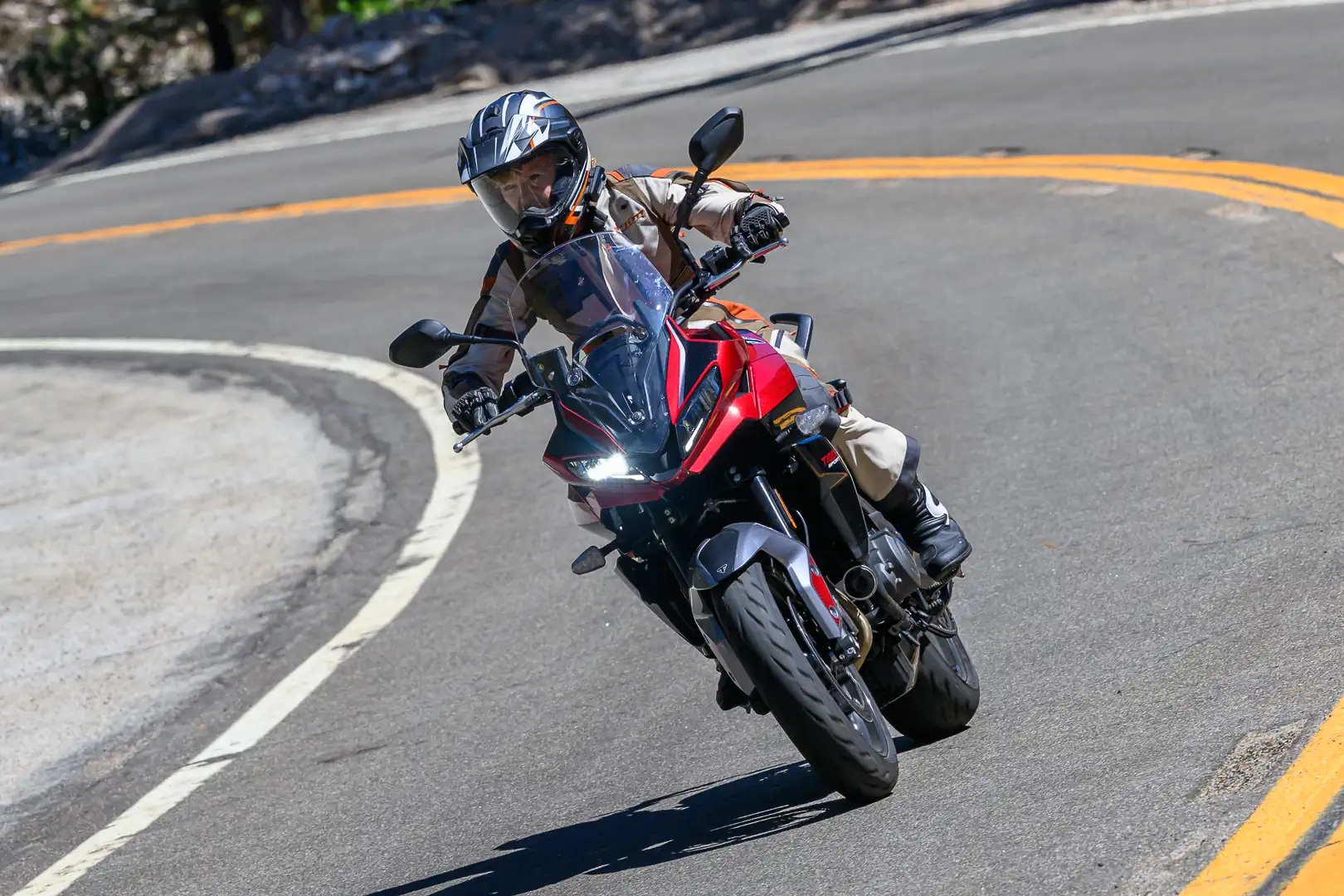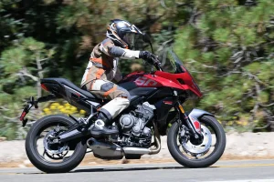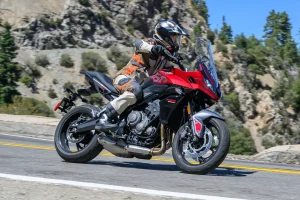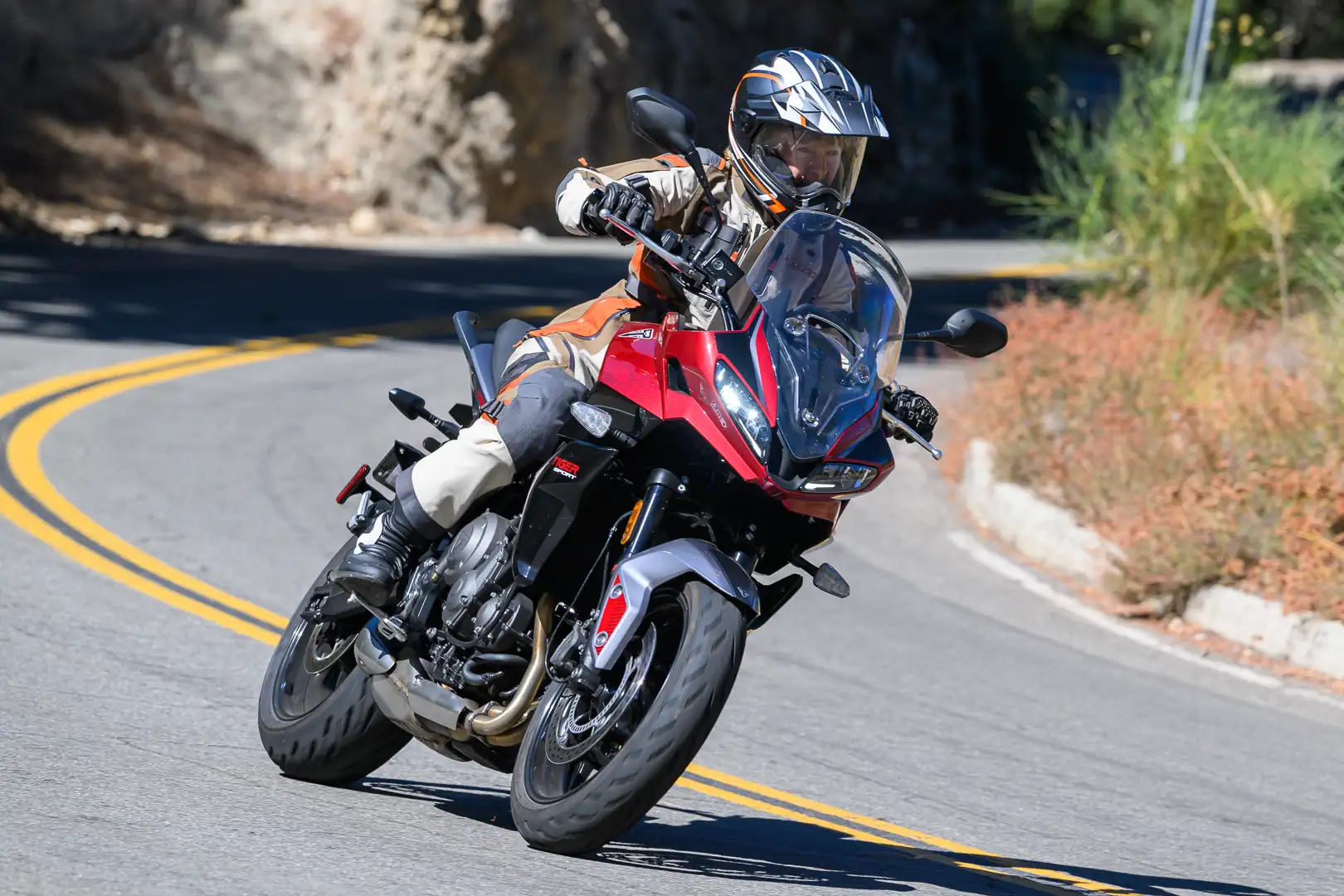 - The Tiger Sport 660 is surprisingly agile and moves through mid-speed corners athletically. Through the tricky decreasing radius turns on iffy pavement in Southern California’s Bouquet Canyon, the 660 is a blast to ride. The wide handlebar leverage and upright seating stance match up well with the bike’s 23-degree rake—steeper than the Trident 660’s—underscoring the sporty side of the sport-tourer. However, when speeds picked up on the better-paved Spunky Canyon—which also has no driveways to temper your speed—the Sport 660’s softer, long-travel suspension and weight caught up with it. I wasn’t able to flick the bike as quickly on the faster corners and found myself falling behind my riding buddy on a pure-sport machine. The Michelin Road 5 tires are impressively predictable and capable.