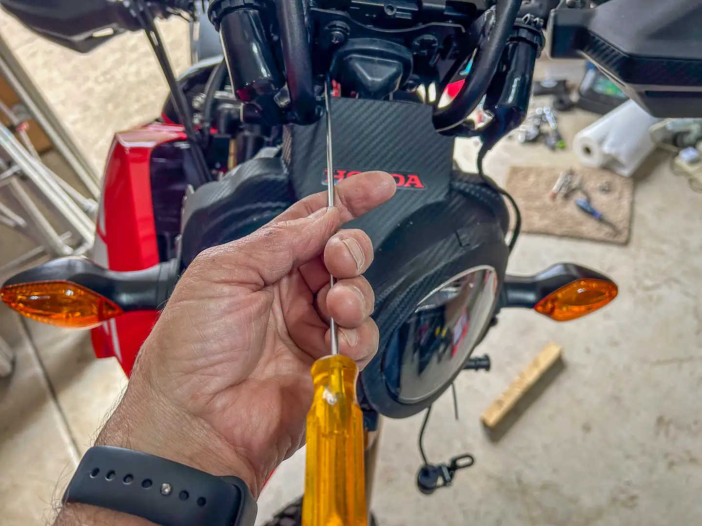The first issue is that there’s no straight shot to the top two screws. Most advice says to remove the headlight because it blocks screwdriver access. I remembered my 14-inch mini blade screwdriver, which I could flex just enough, and it worked. The bottom two screws require dropping the wire tray below the headlight. The hard part isn’t removal—it’s the reassembly around the front-end wiring bundle. The second reinstall took five minutes; the first took at least half an hour. The second was during the installation of the HammerLEDs turn signals, and the third was during the Kisan Headlight Pathfinder modulator install.