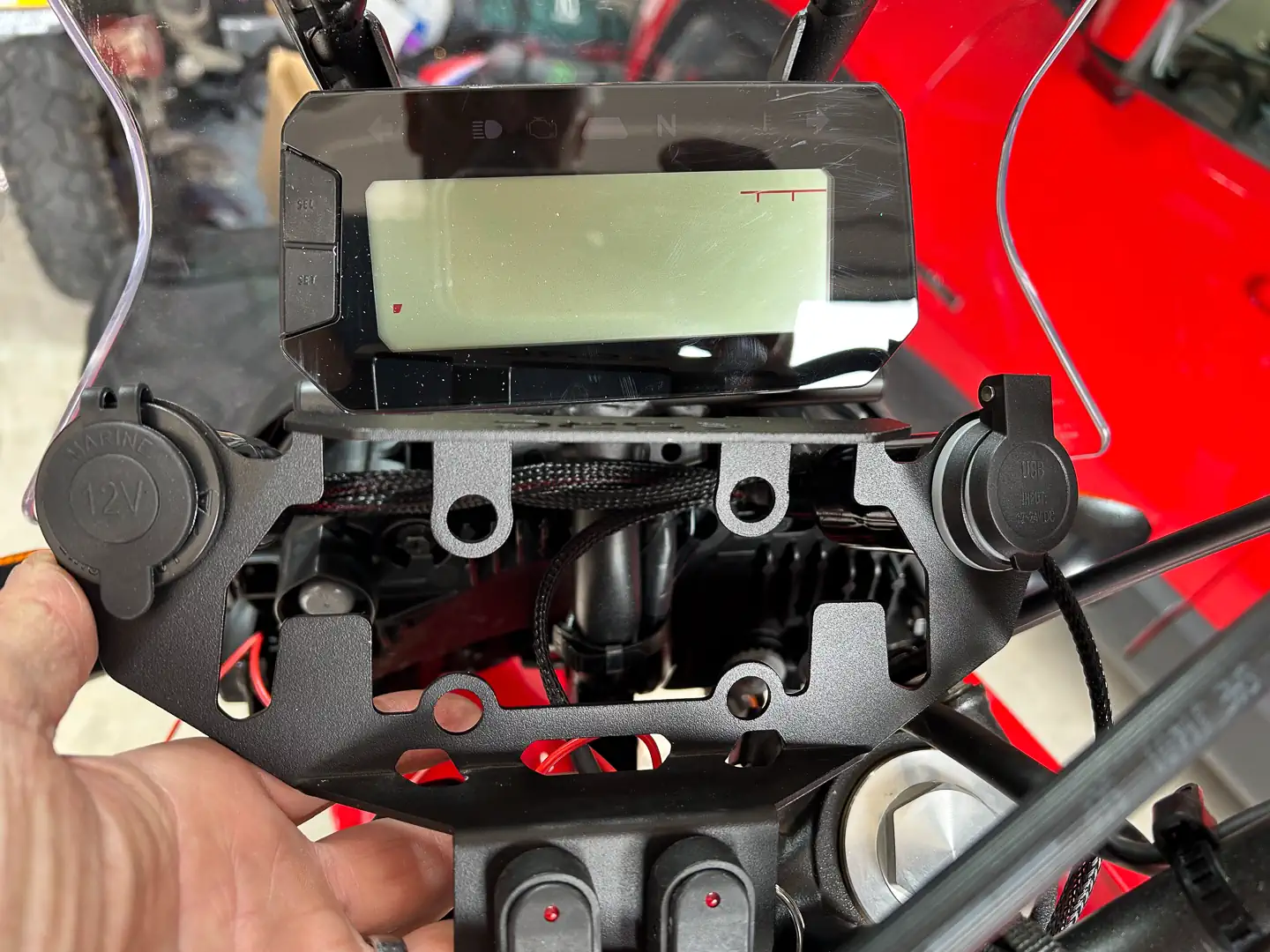 The first upgrade I identified was power for my iPhone and Garmin XT2. The Rally has a 15A power connector under the left front plastic panel. The SRC Full Dash Panel provides a dual USB charger, one 12-volt socket, and two rocker switches with LED indicators. The Dash surrounds the speedo cluster.