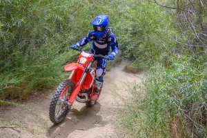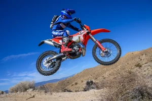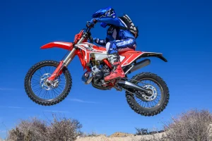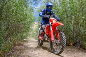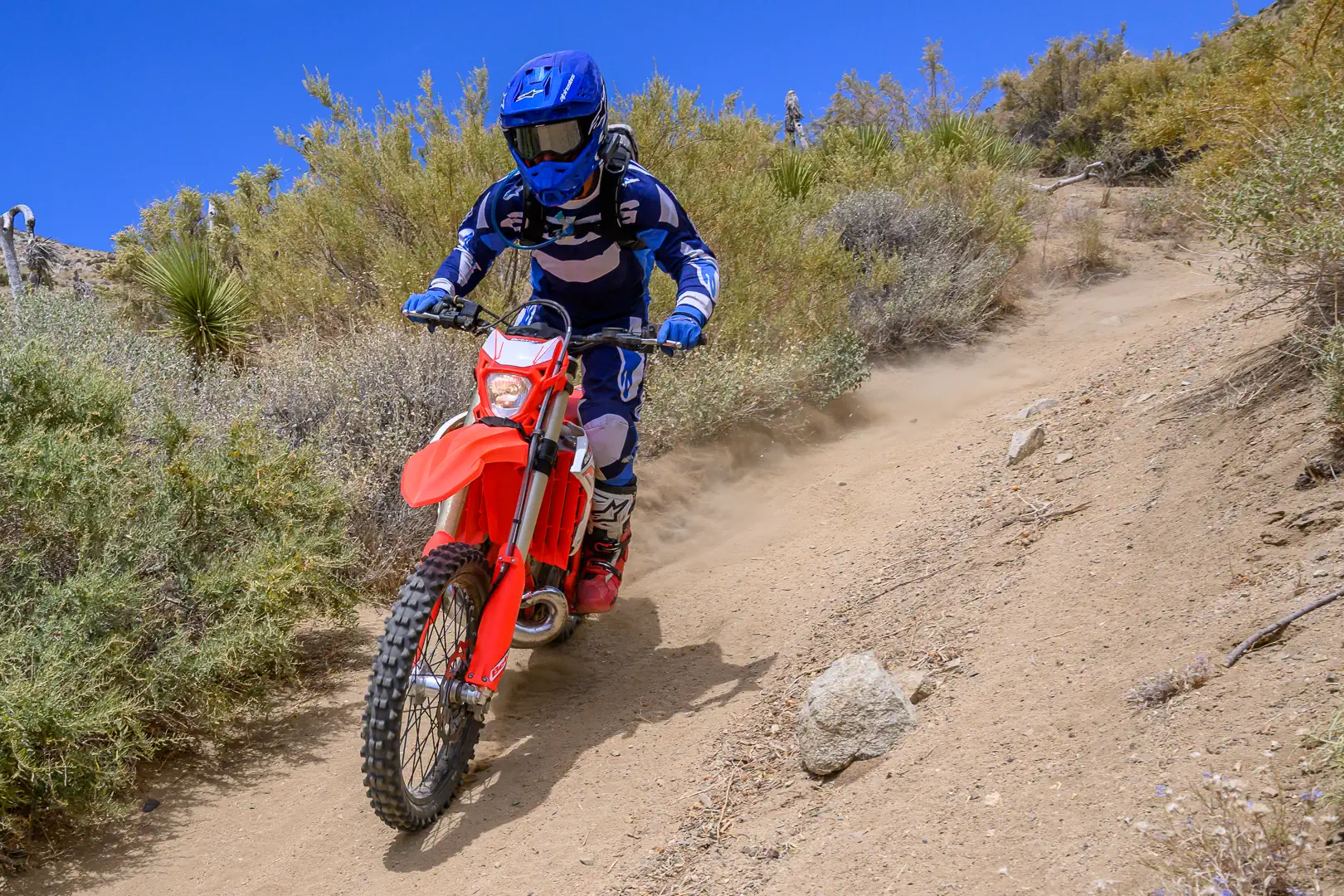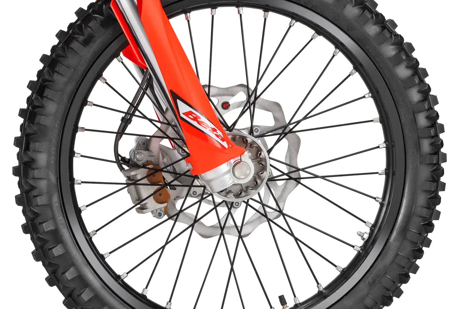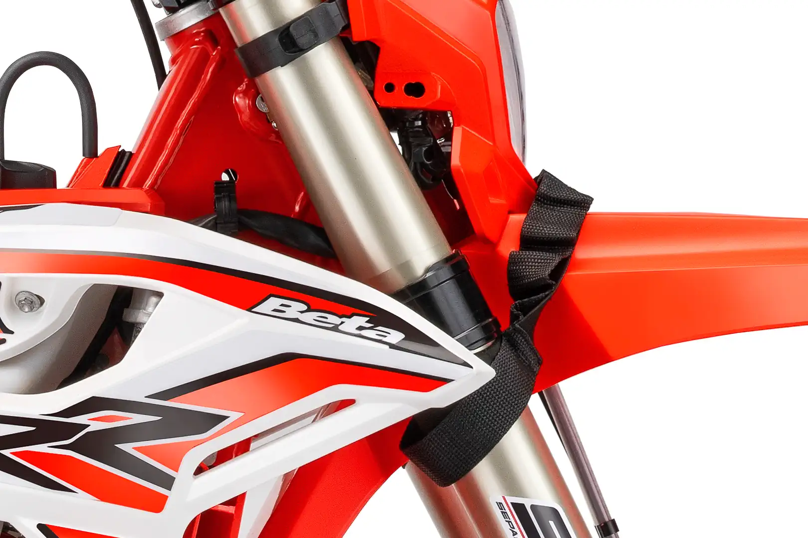 - The all-new chassis is ready for single track. The 2025 Beta 200 RR X-Pro gets a new frame and slightly shorter suspension travel to lower the seat height by three-quarters of an inch. While that’s most appreciated by our shorter test riders, even tall riders benefit from easier access to the ground when the going gets tough. The new bodywork also makes it easier to move around on the 200, which we always appreciate in the woods.