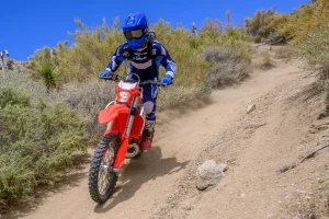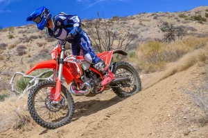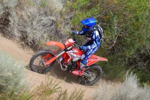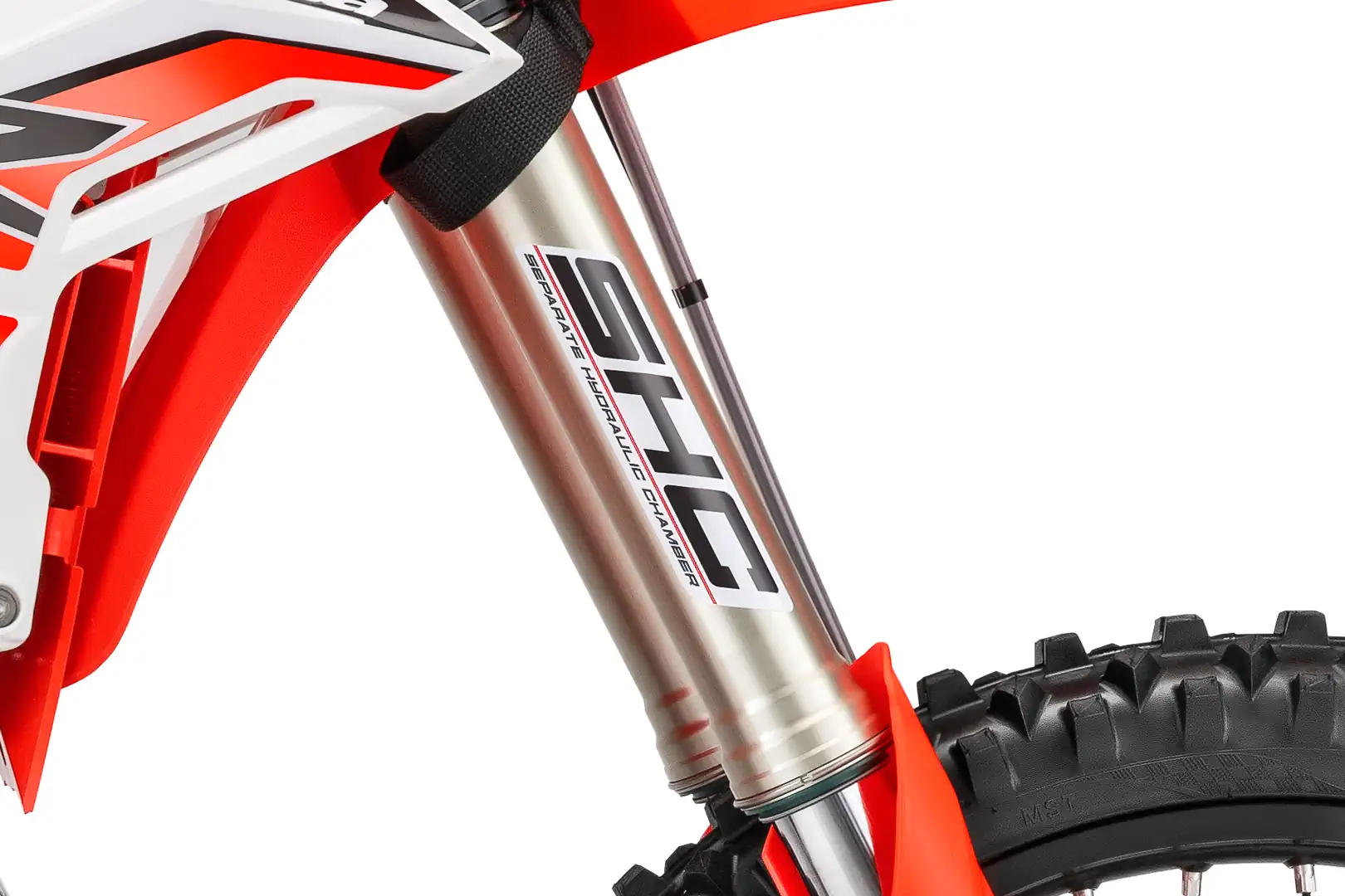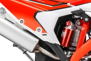 - The new Sachs suspension is another upgrade that closes the gap between the German brand and the competition. The new SHC fork features the damping in one leg and spring in the other, and the new shock is tuned to match. For trail riding, the suspension is more than adequate, even with a relatively short 11 inches at each end, as it is firmed up over the previous year. We have lobbied long and hard for slightly shorter travel in exchange for a lower seat height, and Beta has delivered with the new RR X-Pro models. That philosophy works, making the 200 just that much easier to ride and more appealing to dedicated trail riders who aren’t racing. Of course, if you’re a casual racer, the 200’s Sachs suspension will still be usable for enduro and cross-country action.