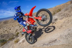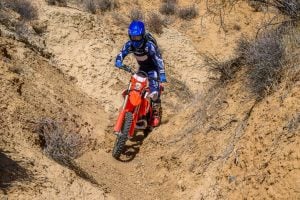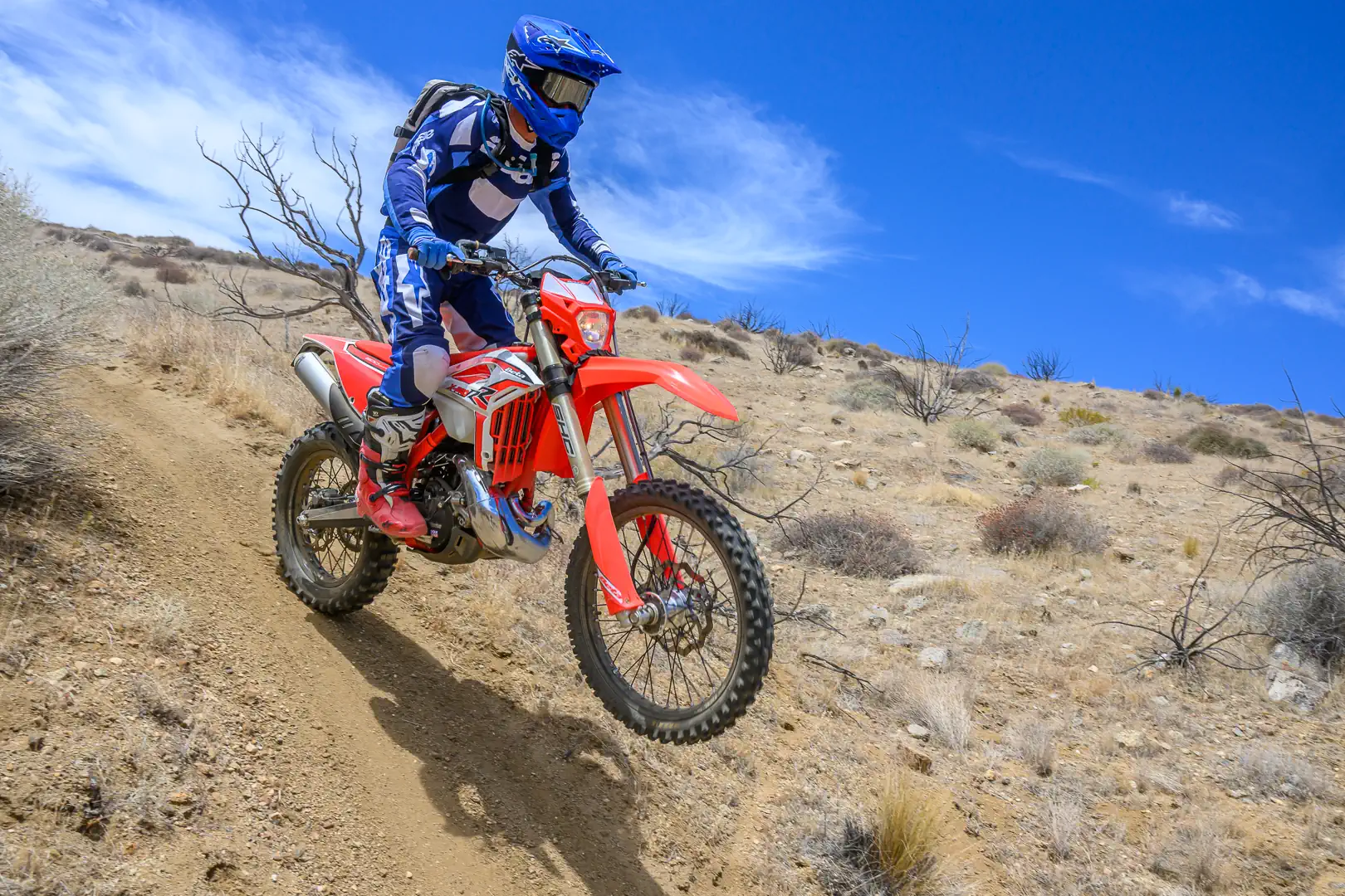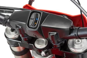 - Although Beta gives the two-stroke an adjustable power valve, we didn’t feel the need to experiment with it. You can switch between the power modes while you’re rolling, though you do have to take one hand off a grip. However, to adjust the power valve, you have to stop. We usually ride on varying terrain, so adjusting the power valve for more bottom or top-end power trades away the engine’s versatility for a specific use. Owners who have set trails will welcome this extra level of adjustability. Now, if Beta made the power valve electronically adjustable from the handlebar, we would be more inclined to use that feature. While we’re making requests, can Beta engineers please move the power mode button to the left switchgear? While racers might not want that, it would be a welcome improvement in convenience and usability for X-Pro owners.