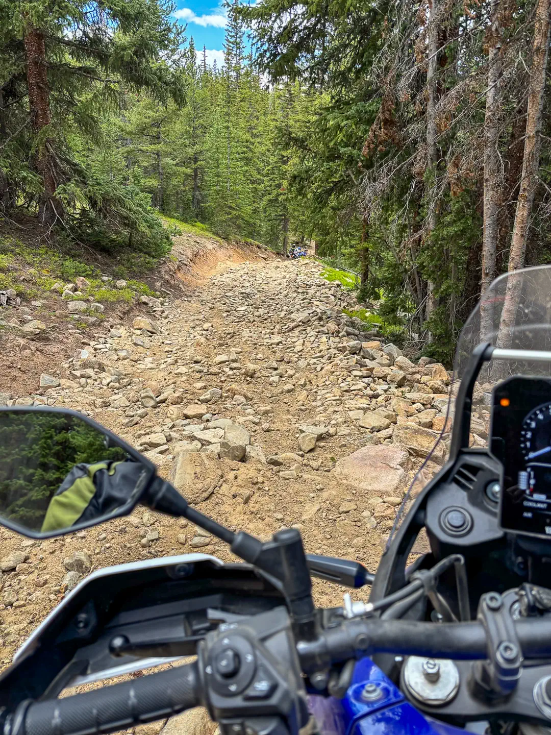 Things didn’t improve, unfortunately. A few miles later, in the lead, I came to a steep, very rocky climb with multiple switchbacks through the dense forest. I wrangled the KTM up with determination and some dumb luck. Behind me, it was chaos.