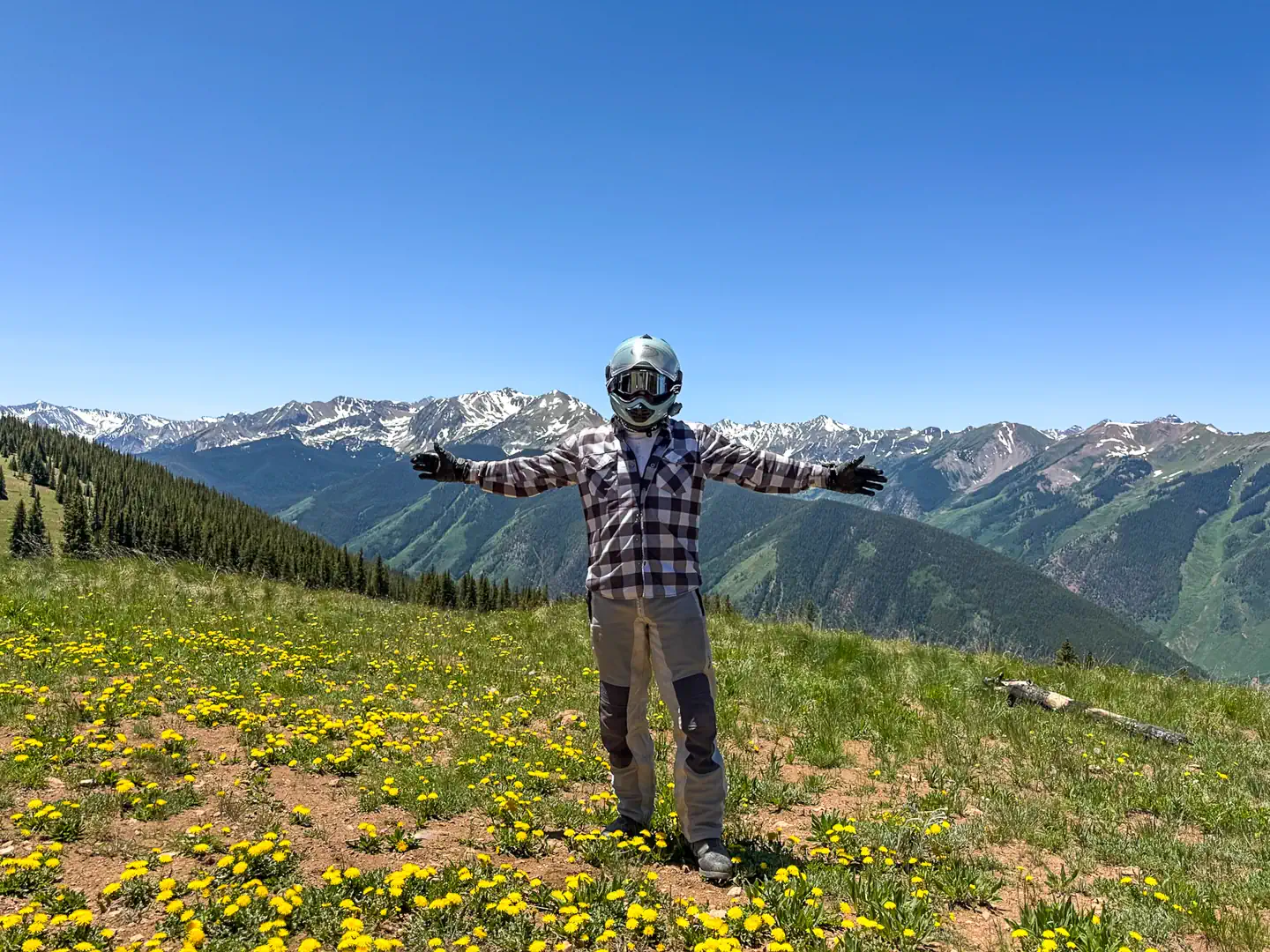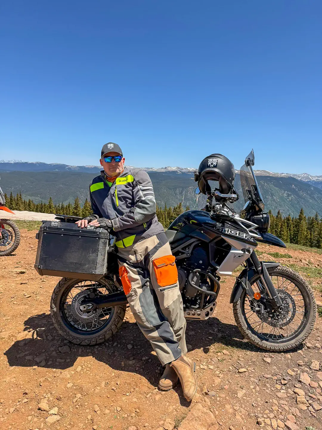 Tiger had previously scouted a loop in his Bronco—up the face of Aspen Mountain, then back through the mountains to Basalt. The ride started great—a beautiful, sun-drenched morning climb up Aspen’s gravel cat tracks and switchbacks. Tiger and Bart led the charge up, tapping into their dirt bike skills, with Chill handling the unfamiliar terrain like a pro.