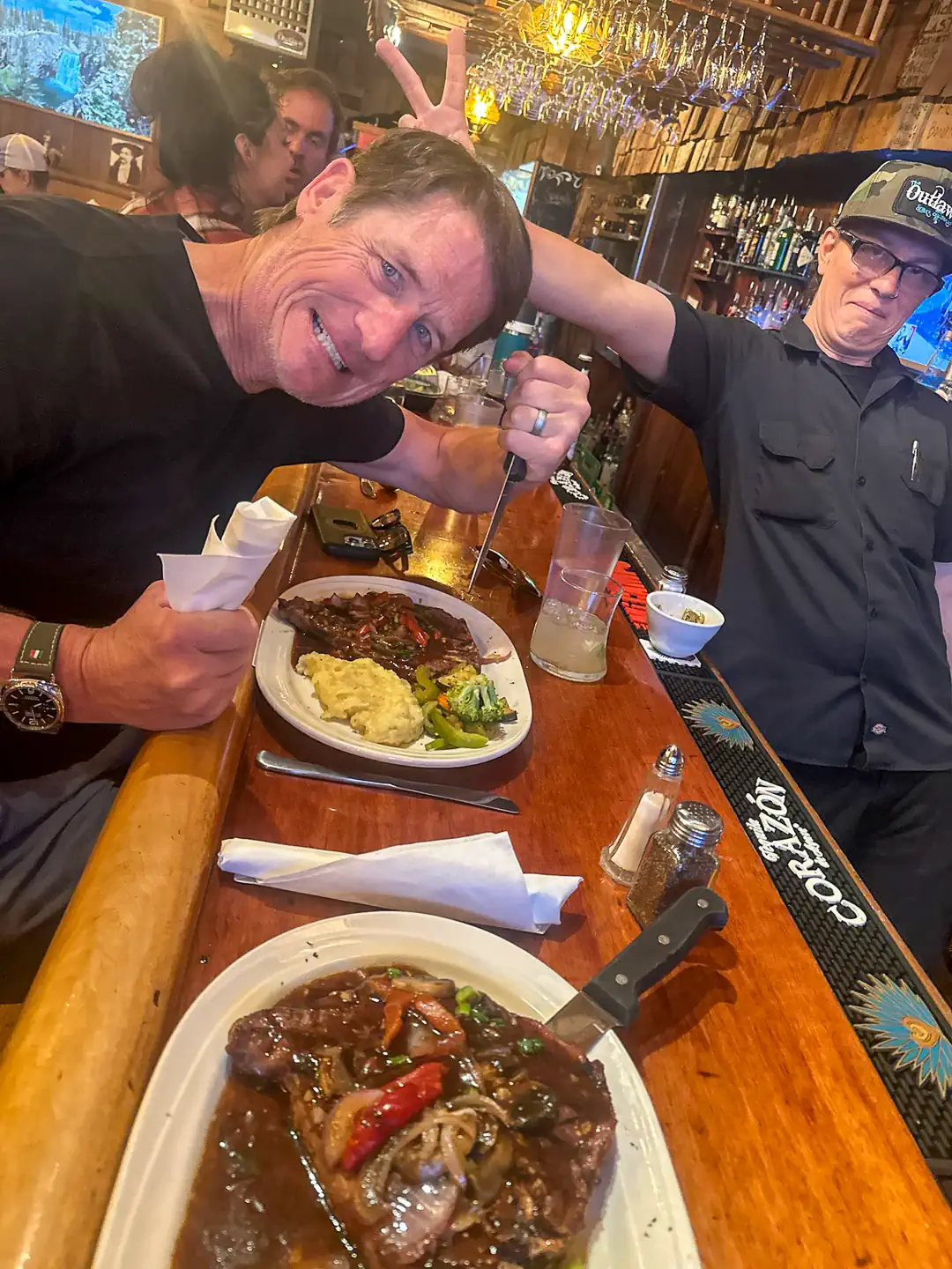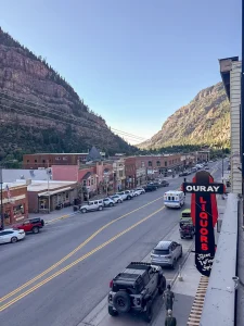 We stopped short at Ouray—a charming historic mining town on U.S. Route 550 tucked in at the end of a box canyon. Dinner and drinks were at The Outlaw Restaurant. It was a solid night with massive steaks, friendly locals, and buying food for soot-covered firefighters just off the lines.