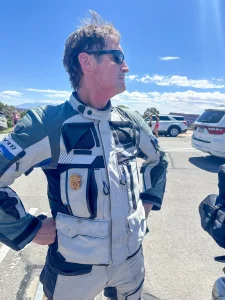 On the Cardo comms, I warned Snake: “Keep your speed up through the sand.” Snake really took that advice to heart, launching himself and his bike five feet into the air like Super Dave Osborne (see opening description).