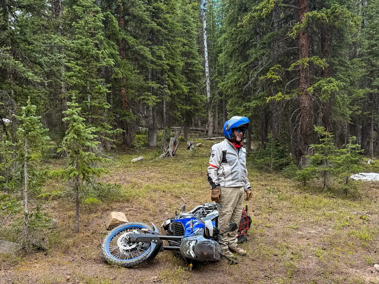 After confirming he wasn’t dead, we wrestled the bike—wheels uphill—back upright. Snake, battered but determined, tried again and aced it.
