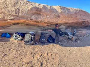 One mile later, our hearts sank as we faced the final climb—a steep, narrow, rocky path cut into the side of a cliff that ended at our campsite. It wasn’t terribly technical, but the 100-foot drop and loose conditions added drama. We reached the top exhausted, cracked open our “medicinal” tequila, and soaked in one of the best views on earth.