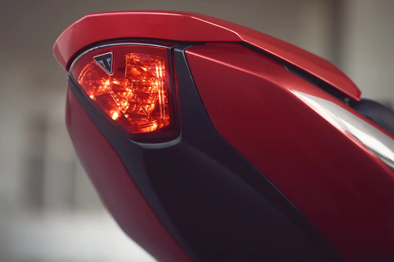 - Triumph-branded calipers handle deceleration chores. The 310mm discs in the front are slowed by radially mounted four-piston calipers, while a single-piston caliper works on the 220mm rear disc. ABS is cornering-aware, though not adjustable.