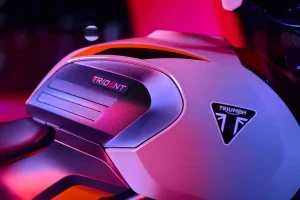 - Retro-styling informs, but does not dominate, the Trident 800. The headlight and dash are round. However, the dash juts out aggressively above the headlight and features a flyscreen. The turn signals and license plate holder are swingarm-mounted and hug the 180/55 rear tire. The fuel tank recalls the 1960s with its knee indentation, while the tail section floats with seating and the tail/brake light. Below the engine is a color-coded chin spoiler. Triumph says the Trident has a “dynamic roadster stance.”