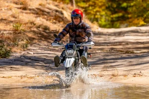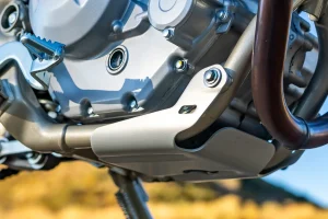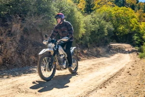 Riding off-road, even on fairly technical terrain, the Sherpa S does, indeed, make it easy. Confidence is enhanced by the low seat height, and the suspension does an impressive job of resisting bottoming, as long as both wheels remain in contact with the ground. Even minor air blows through the suspension on landing, reminding you that this is a motorcycle for boondocking. When riding at a faster pace, respect its limitations. Watch out for rocks, as 8.5 inches of ground clearance is less than we’re used to on a dirt bike. Even though there’s a skid place, no one wants to hear a clank.