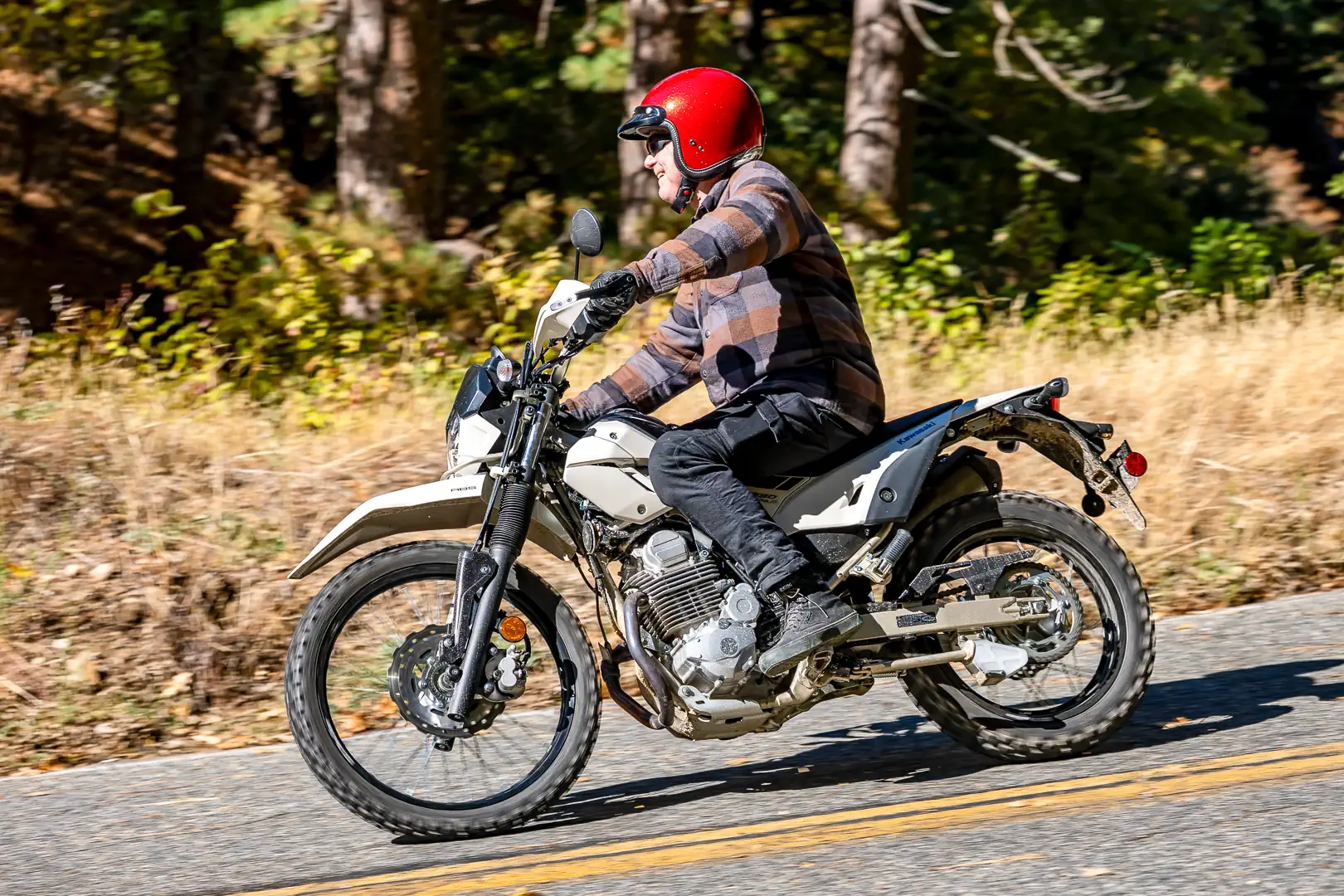 Take the 2026 Kawasaki KLX230 Sherpa S on the pavement, and the firmly sprung suspension makes for good handling in the twisties. City riding is great fun, thanks to the low-slung chassis, which gives the bike fantastic maneuverability. If you feel the need to hop a curb, go for it—the suspension can handle it.