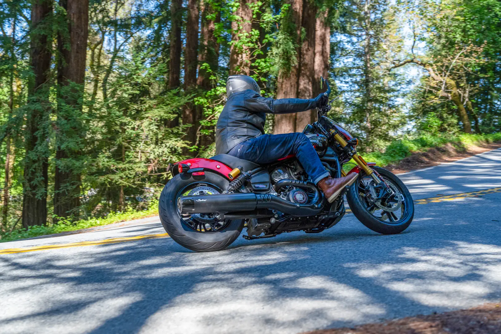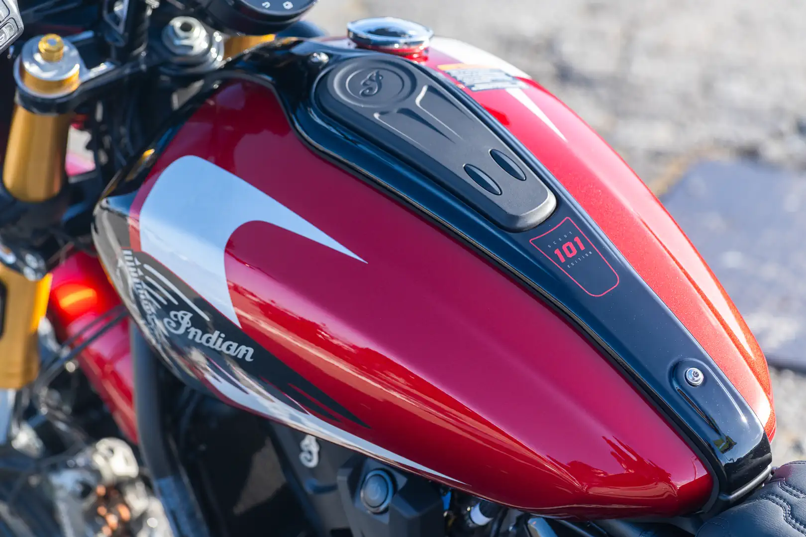 1. The suspension action is also fantastic when riding in a sporting manner, even on the rougher portions of Mulholland Drive. It’s easy for suspension to work well on fresh, smooth pavement, as long as the settings aren’t pure mush. The 101 is poised at both ends, even when the pavement gets uneven. This extends down to the flats, where dips and potholes are constant threats. Scout riders are used to tightening their sphincters when approaching a rough patch, a reaction that is unnecessary on the 101 Scout. While you’ll still feel the imperfection in the road, the jolt you’re expecting doesn’t come. If you have a Scout that’s not the 101, Indian will sell you the high-performance shocks for $830 a pair—they’re worth it.