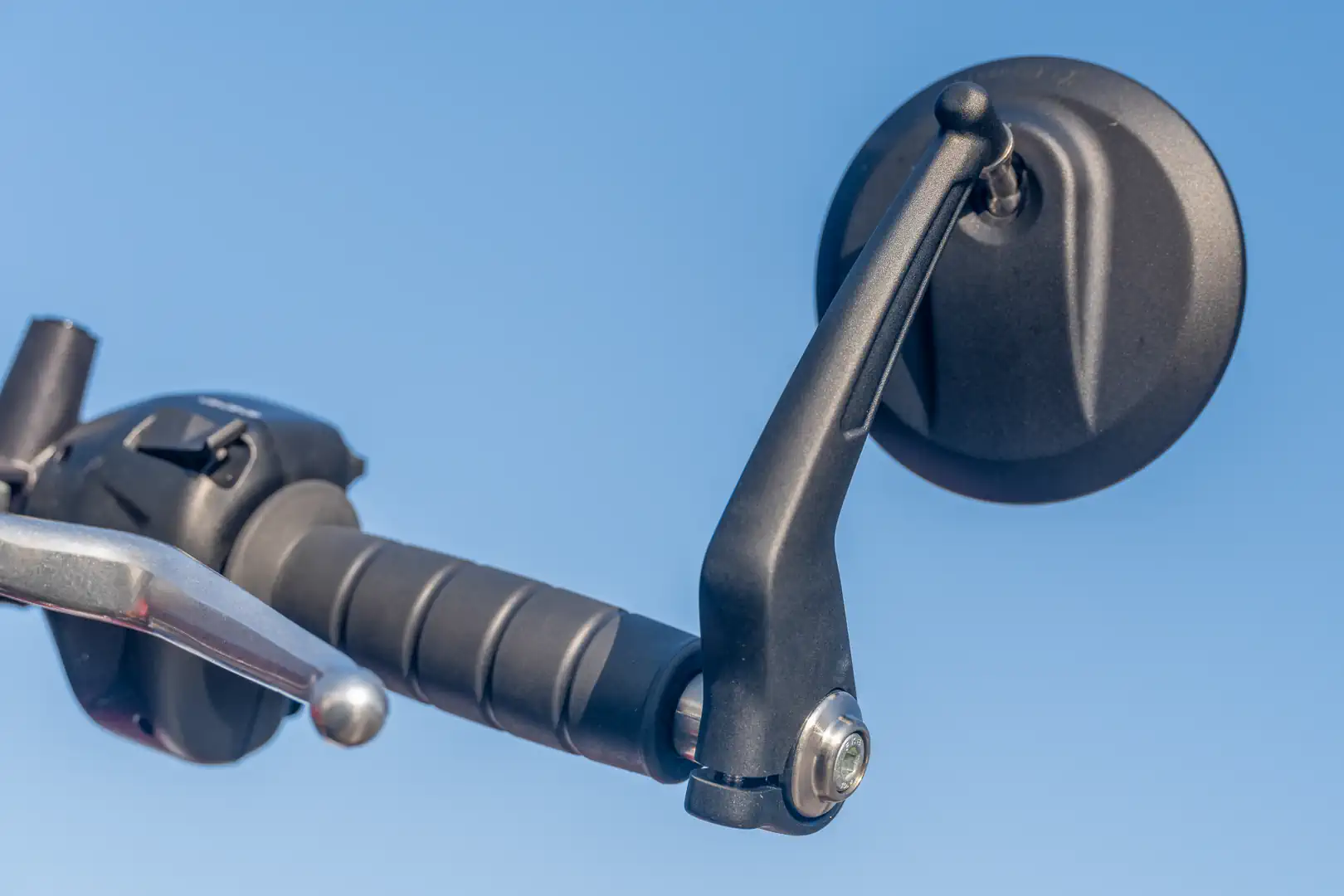 1. With bar-end mirrors, filtering through traffic requires a strong sense of place. They seem to be just the right height for arguing with the side-view mirrors of the majority of four-wheelers on Los Angeles roads. Bobbing and weaving in traffic is the best solution. If you’re willing to sacrifice a bit of cool, there are mounts for standard mirrors on the clutch and brake lever perches. Alternatively, you can spin the bar end mirrors 180 degrees so they’re positioned below the grips. This is a practical choice if you’re not concerned about what’s going on behind you—a perfectly laudable attitude.