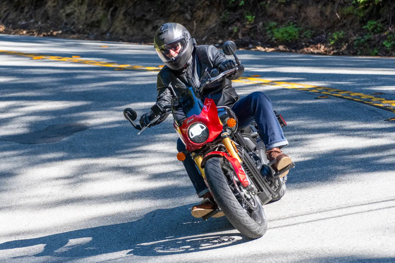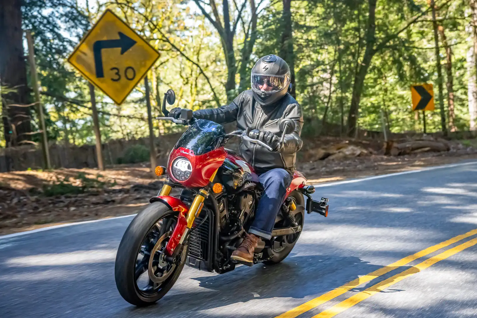 1. Urban manners of the 101 are impeccable. The flagship Scout looks great around town, where other motorists will vocally show their approval. We rode the Sunset Red Metallic version, and it looks spectacular. The riding position with the cupped solo seat is pure cruiser, with feet and fists leading the charge as they reach the forward-mounted pegs and nearly flat-bend, narrow handlebar. You can back up the profiling attitude with commanding acceleration, as long as you’re willing to twist the throttle. First gear is high, so a substantial collection of revs and a bit of clutch slipping goes a long way toward establishing dominance off the line.