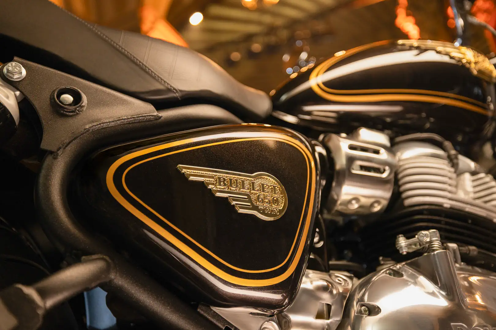 - In the United States and Europe, only one color is on offer—Cannon Black. That only tells part of the story, as gold pinstripes add character, along with the 3D Royal Enfield badges on the tank and Bullet 650 Twin badges on the side covers. A decal that reads “Made Like A Gun” adorns the top of the 3.9-gallon fuel tank, just below the flip-up filler cap.