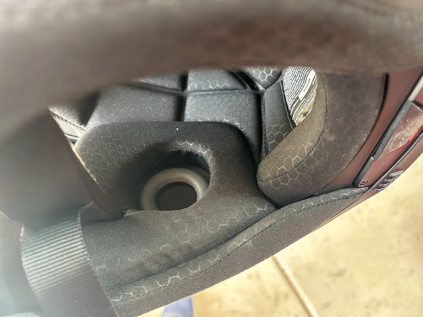 The washable, moisture-wicking interior has a soft texture and is very comfortable on my cheeks and forehead. My ears fit nicely into the acoustic ear cups, so there is no speaker pressure to discover after several hours. The neck roll and chin skirt are one piece, with the two ear cups and crown making up the four interior pieces. With the chin skirt integrated into the neck roll and reducing sound, there is no way to add extra airflow up under the chin on the very hot days.
