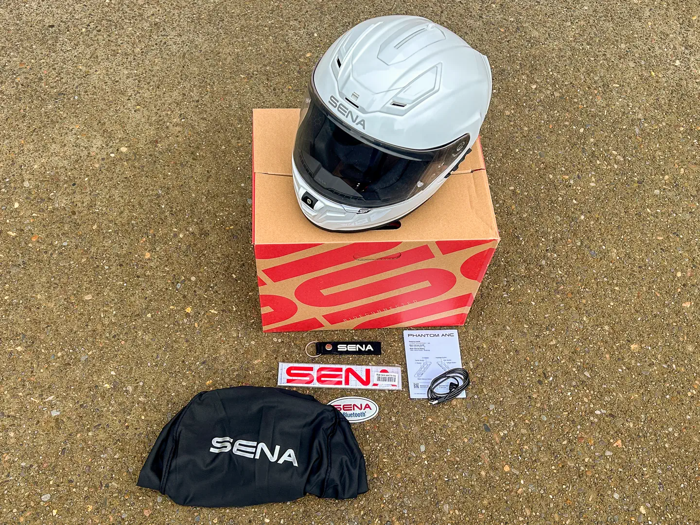 In the box for the Sena Phantom ANC, you’ll find the helmet, a protective helmet bag, a USB-A to USB-C charging cable, two mic muffs (which I never needed to use), a quick-start guide, Sena stickers, and a Sena keyring. The Phantom ANC is available in five sizes, ranging from Small to XXL, and you have a choice of either Gloss White or Gloss Black finish. The helmet has DOT and ECE 22.06 certification.
