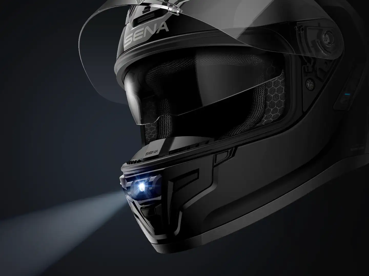 The clear faceshield can be changed without tools, and it has a generous left-hand ledge for lifting and lowering. It has eight positions from locked down to fully open. The cracked position worked great to keep the fogging down when moving in slow traffic. Sena’s only optional shield right now is a tinted one for $40.
