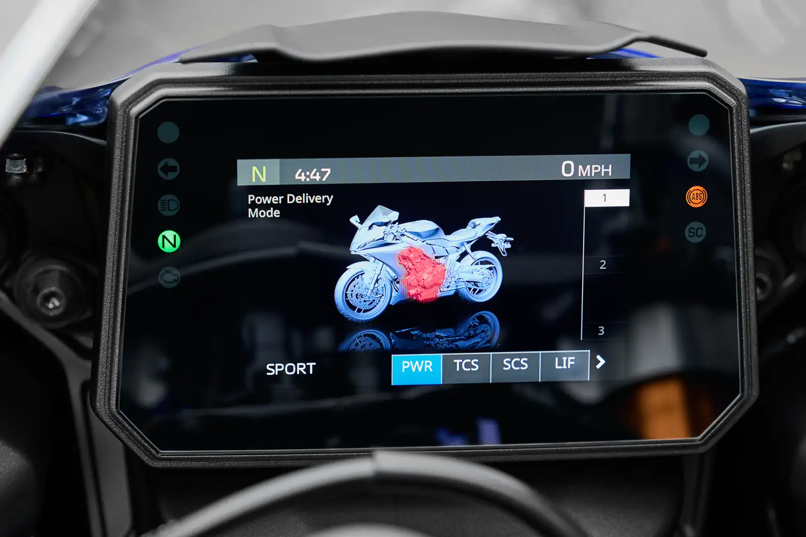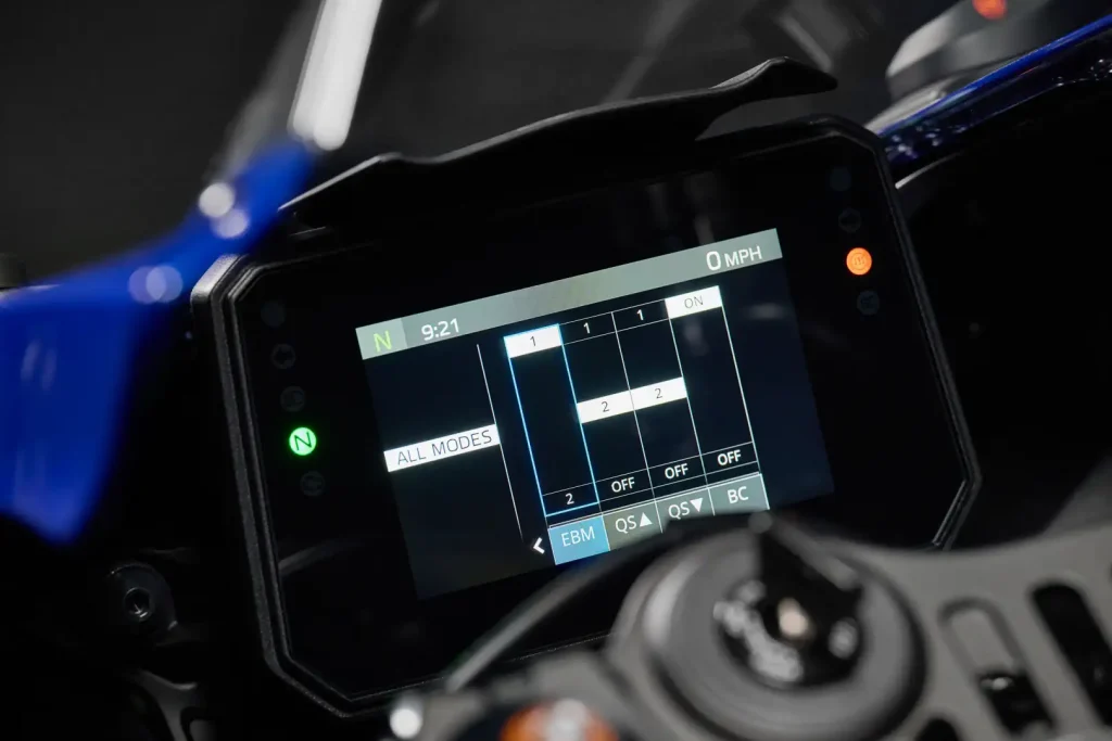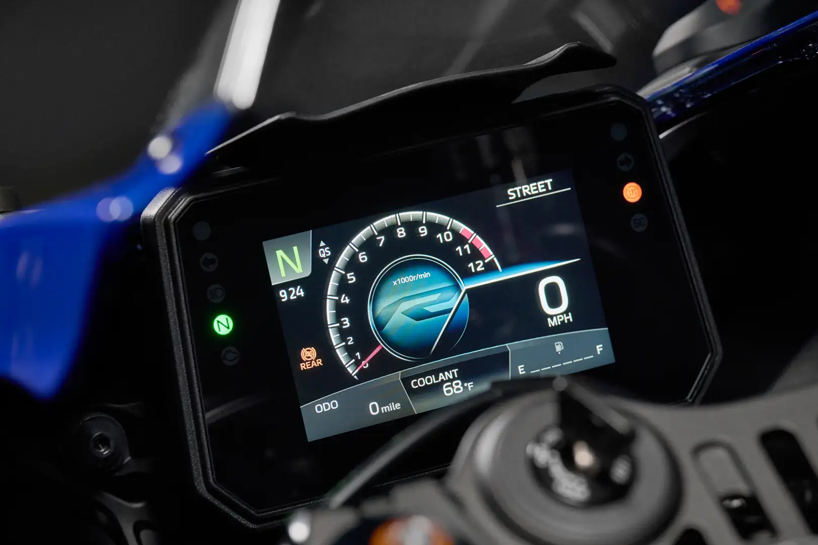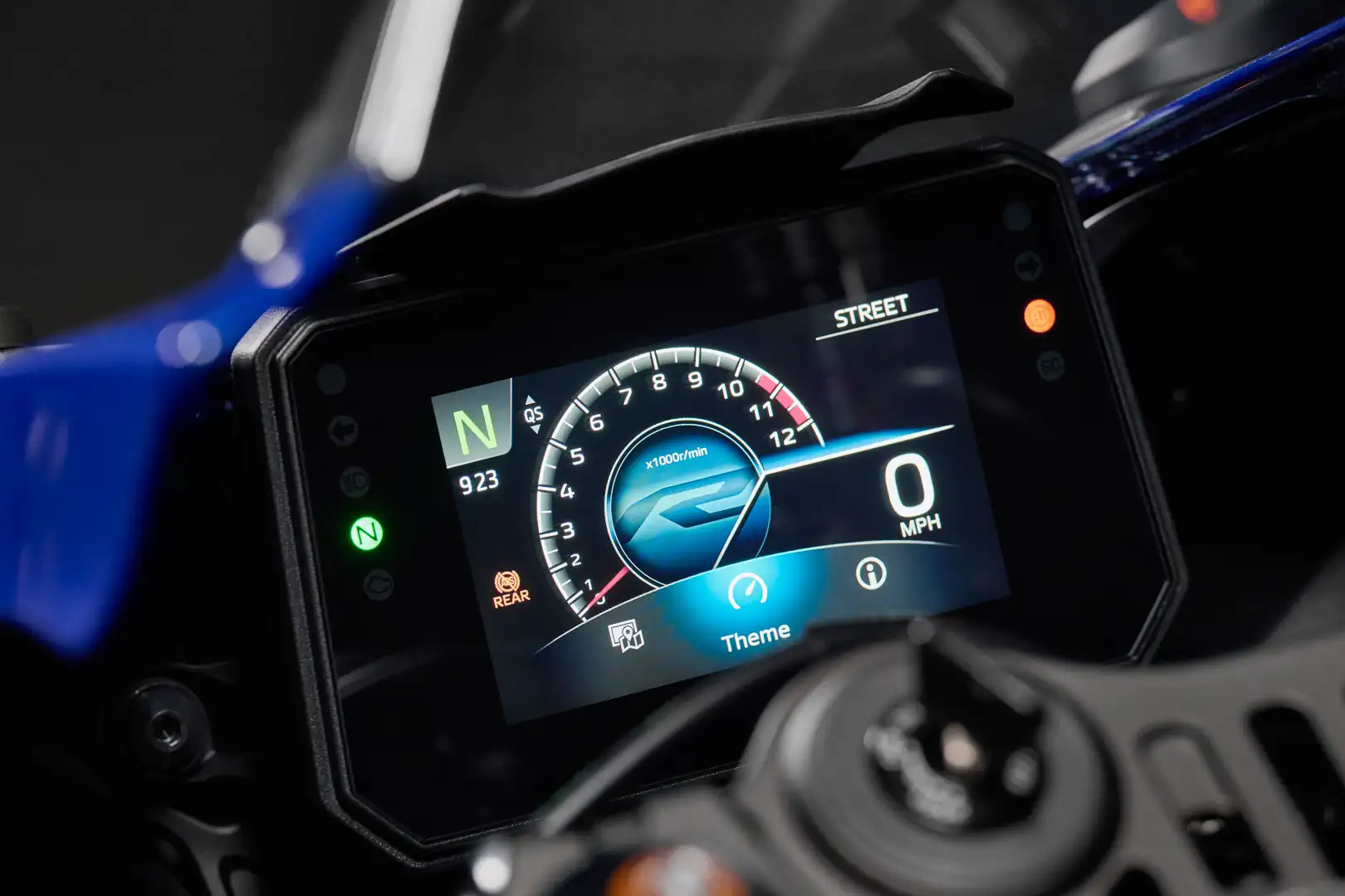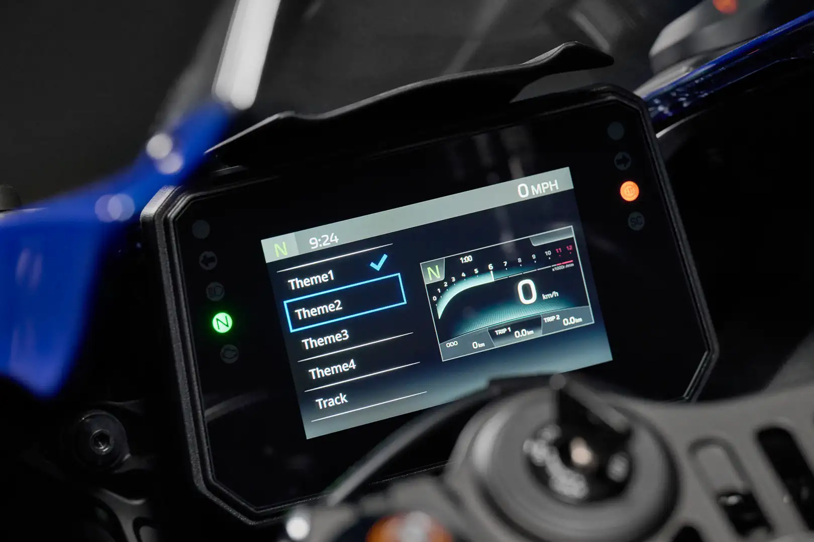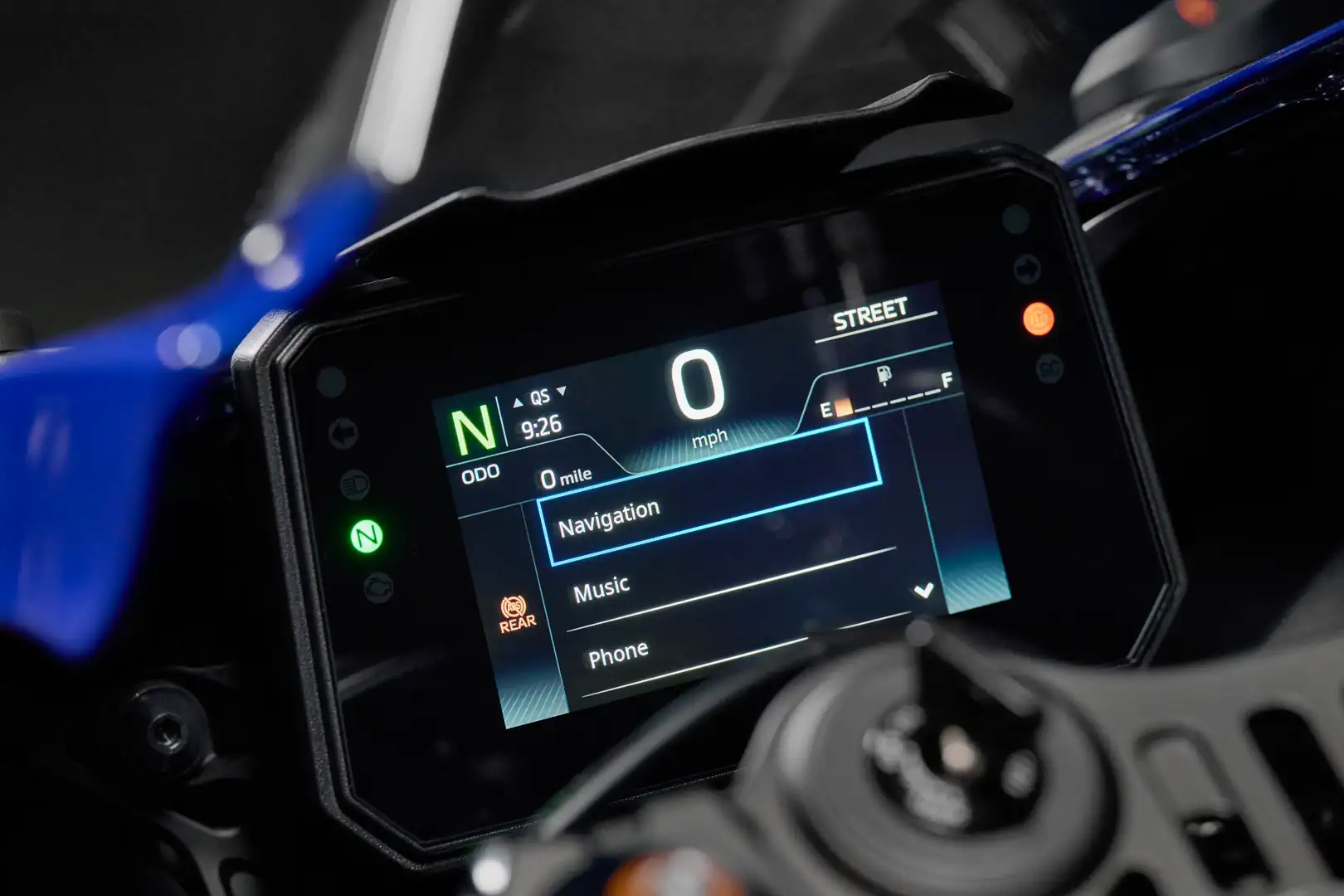 - A five-inch full-color TFT dash offers four themes, plus a track mode. The Yamaha Y-Connect app pairs with the rider’s smartphone and intercom for calls, texts, and music via Bluetooth. Full Garmin StreetCross turn-by-turn navigation is part of the package.