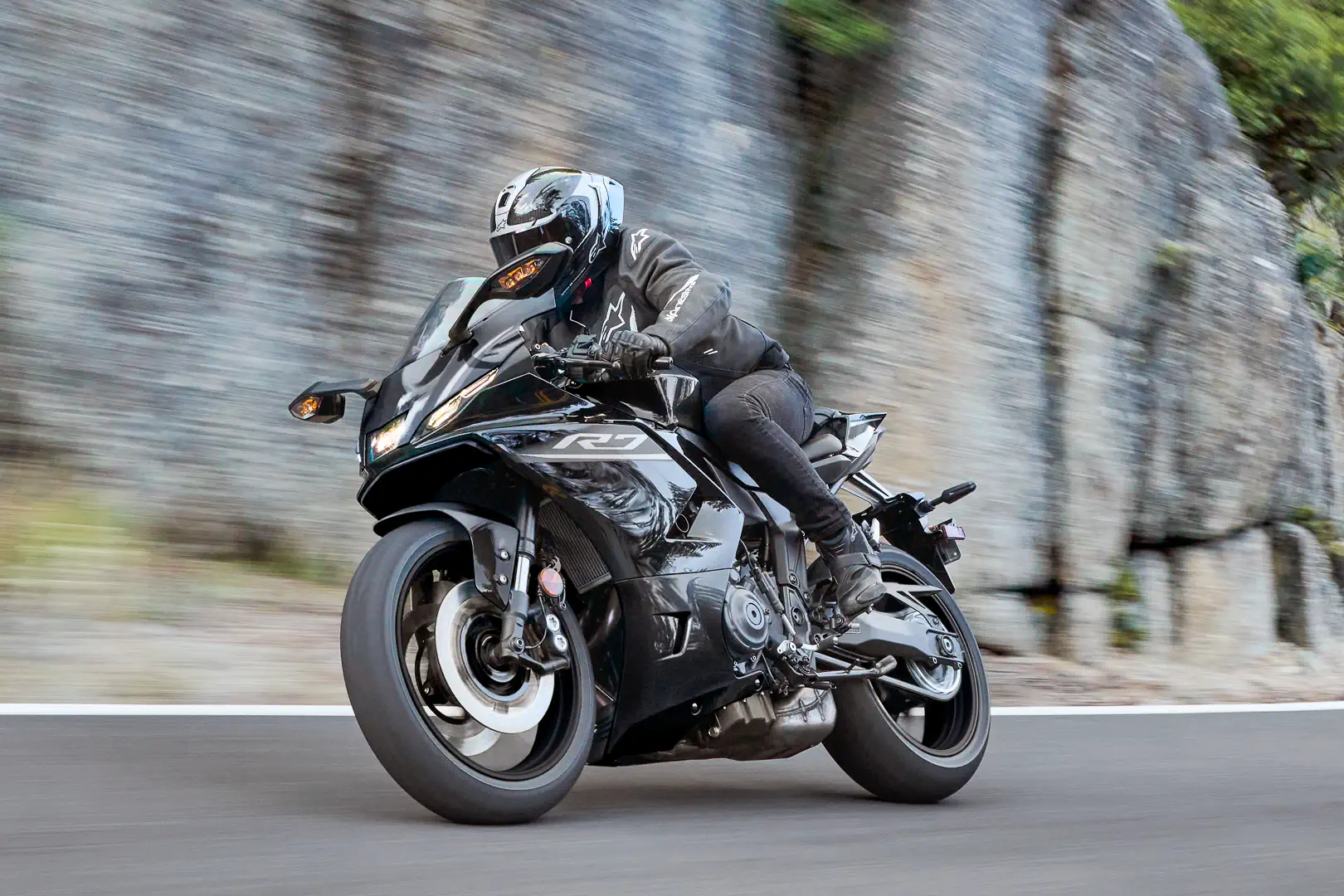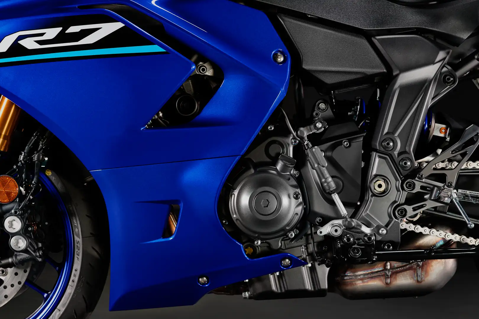 - The new R7 gets the MT-07’s intake duct and asymmetrical funnels. This channels the CP2 engine’s raw induction roar straight to the rider, sharpening the feel of acceleration, both substantively and emotionally. Otherwise, the parallel twin is unchanged.