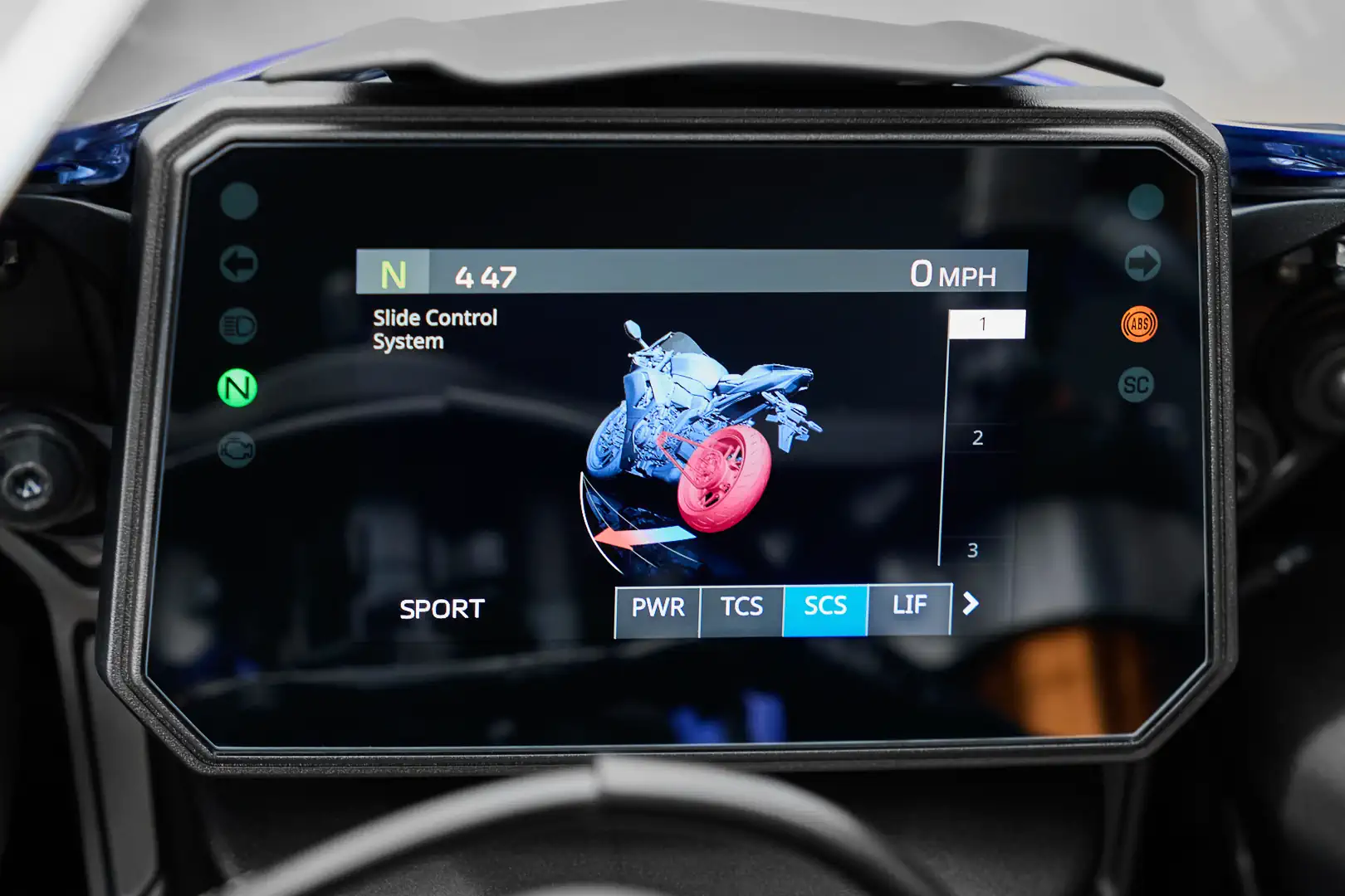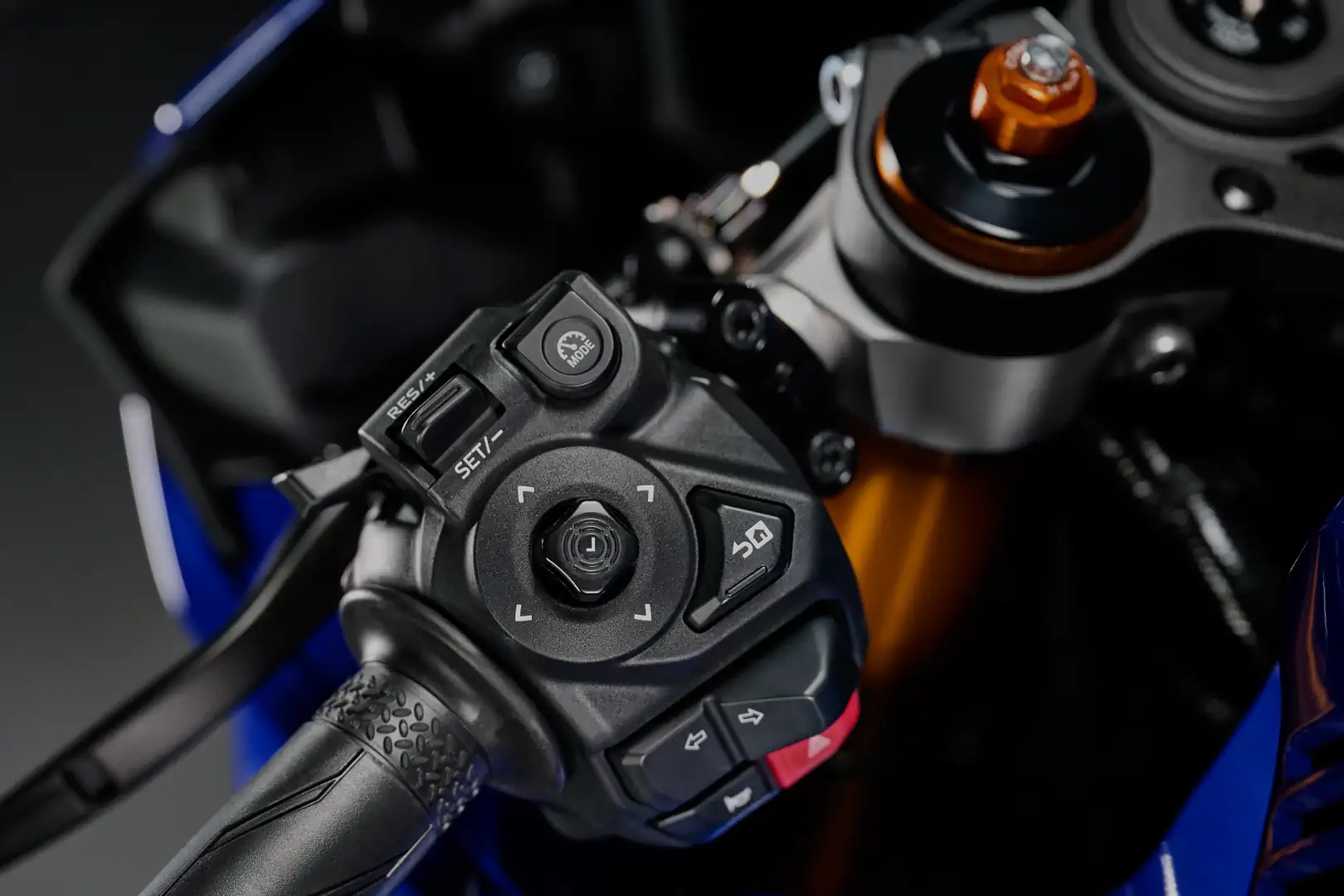- A six-axis IMU informs the ride-by-wire electronic package. Derived from the R1 superbike, the R7’s IMU feeds real-time data to the ECU. Lean-sensitive aids include adjustable traction control (four levels, plus off), slide control (four levels, plus off), wheelie control (four levels, plus off), engine braking control (two levels), launch control, and ABS (front-only available). Cruise control is updated and standard, while the turn signals are self-cancelling.